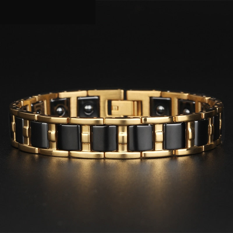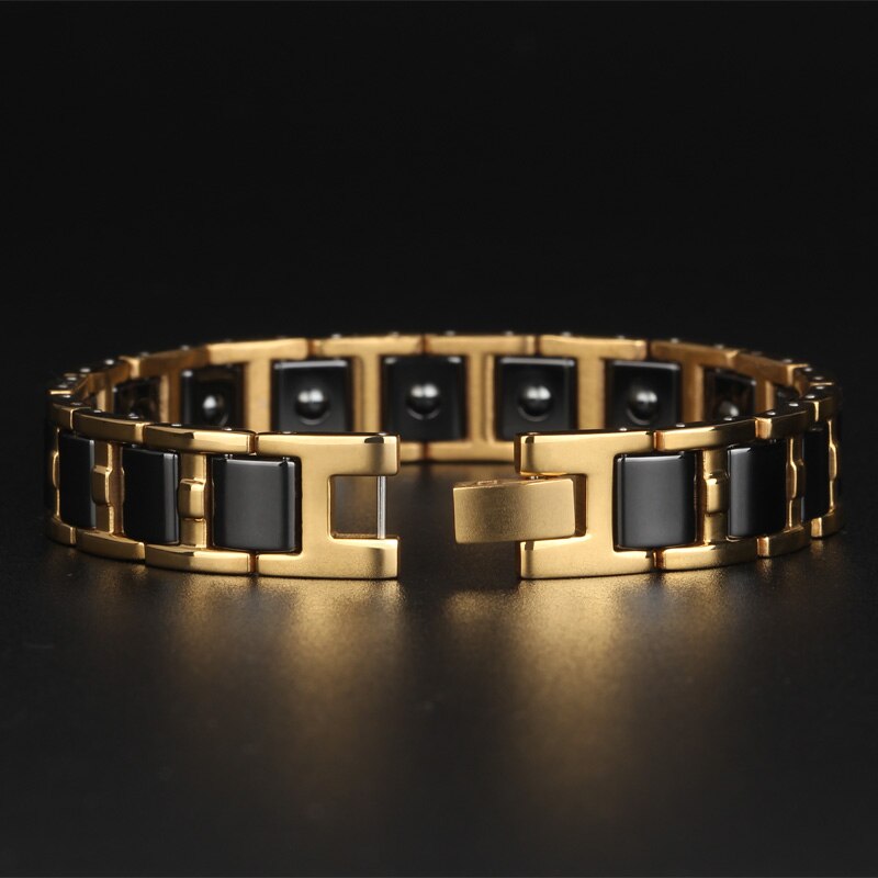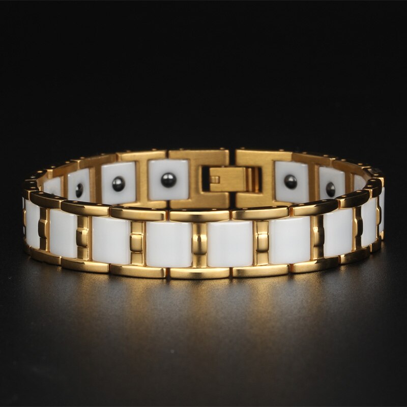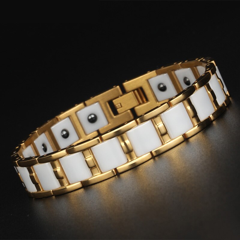 Pulsera magnética Healthy Balance para hombre, de acero inoxidable, color dorado brillante, para mujer, de cerámica negra y blanca.