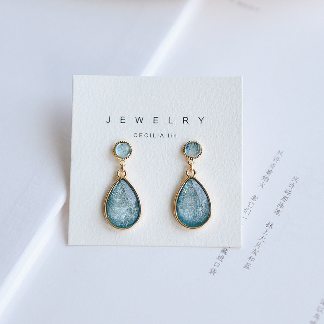 Pendientes de moda japoneses sencillos con diseño de gota de agua y piedra de cristal azul para mujer, sin perforaciones, regalo para niña coreana.