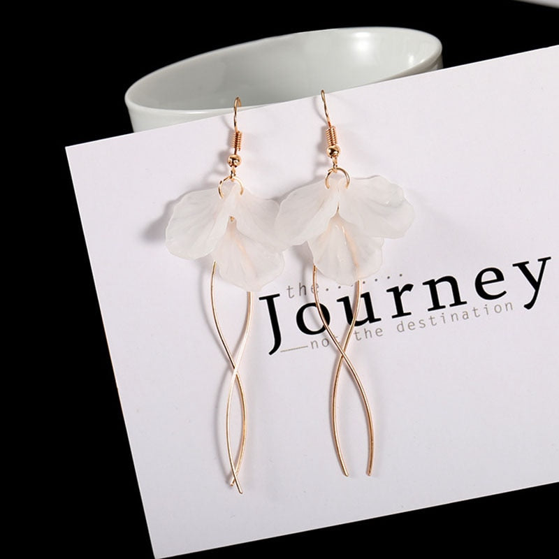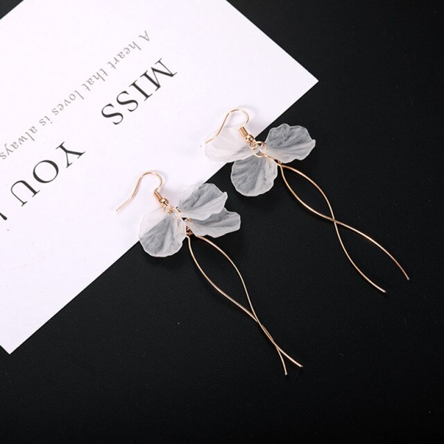 Pendientes largos de clip con pétalos de acrílico blanco coreano para mujer