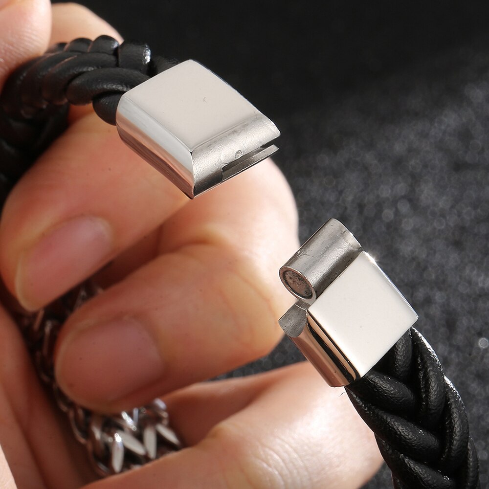 Pulsera de cuero para hombre, de acero chapado en oro, con cadena de eslabones cuadrada, con cierre magnético.