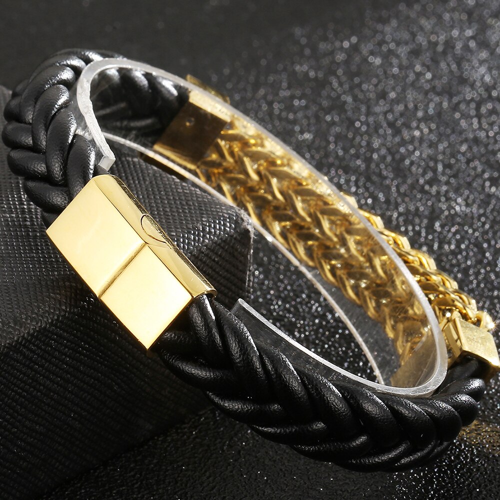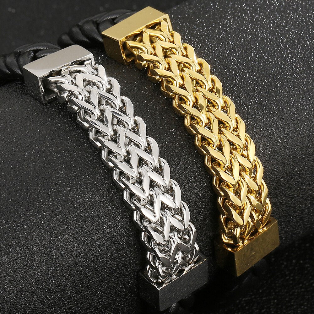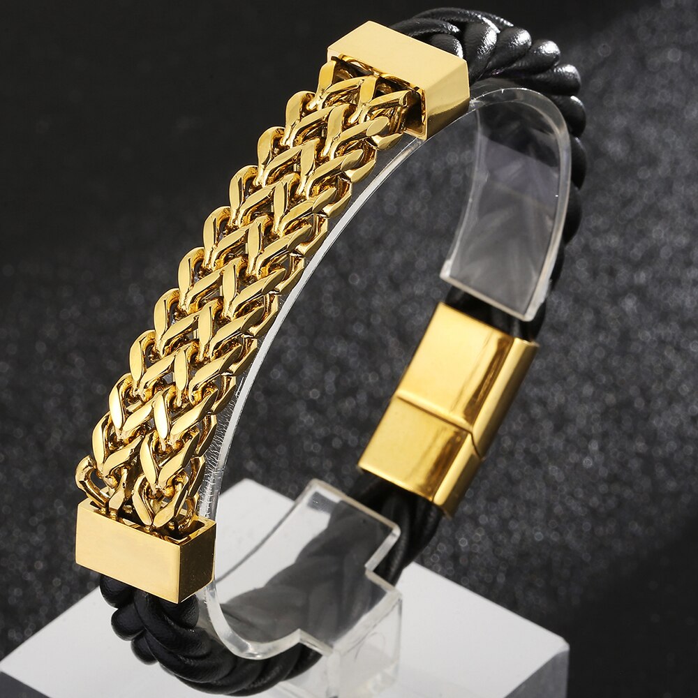 Pulsera de cuero para hombre, acero chapado en oro, cadena de eslabones cuadrada Franco, pulseras para hombre