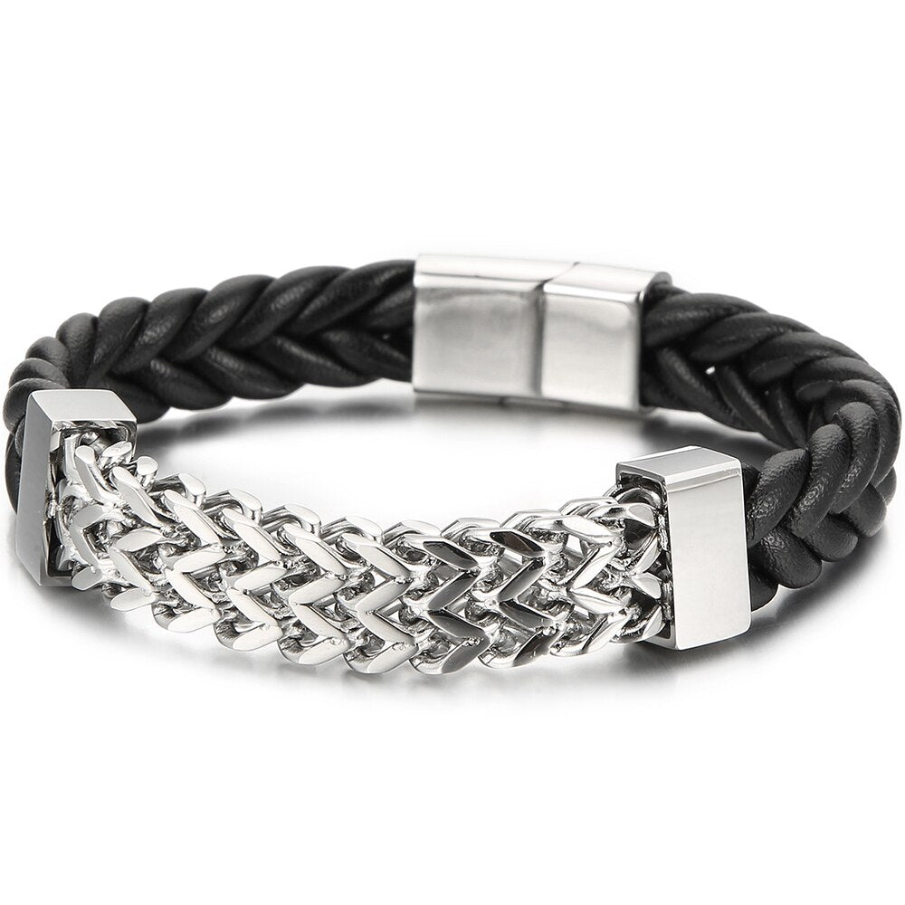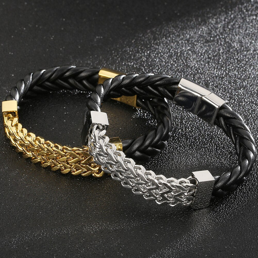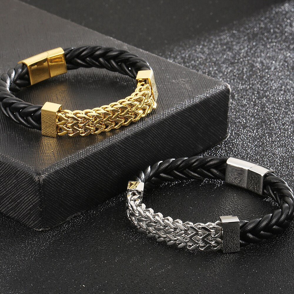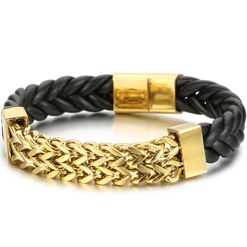 Pulsera de cuero para hombre, acero chapado en oro, cadena de eslabones cuadrada Franco, pulseras para hombre