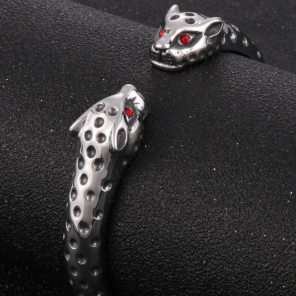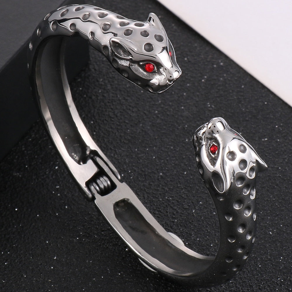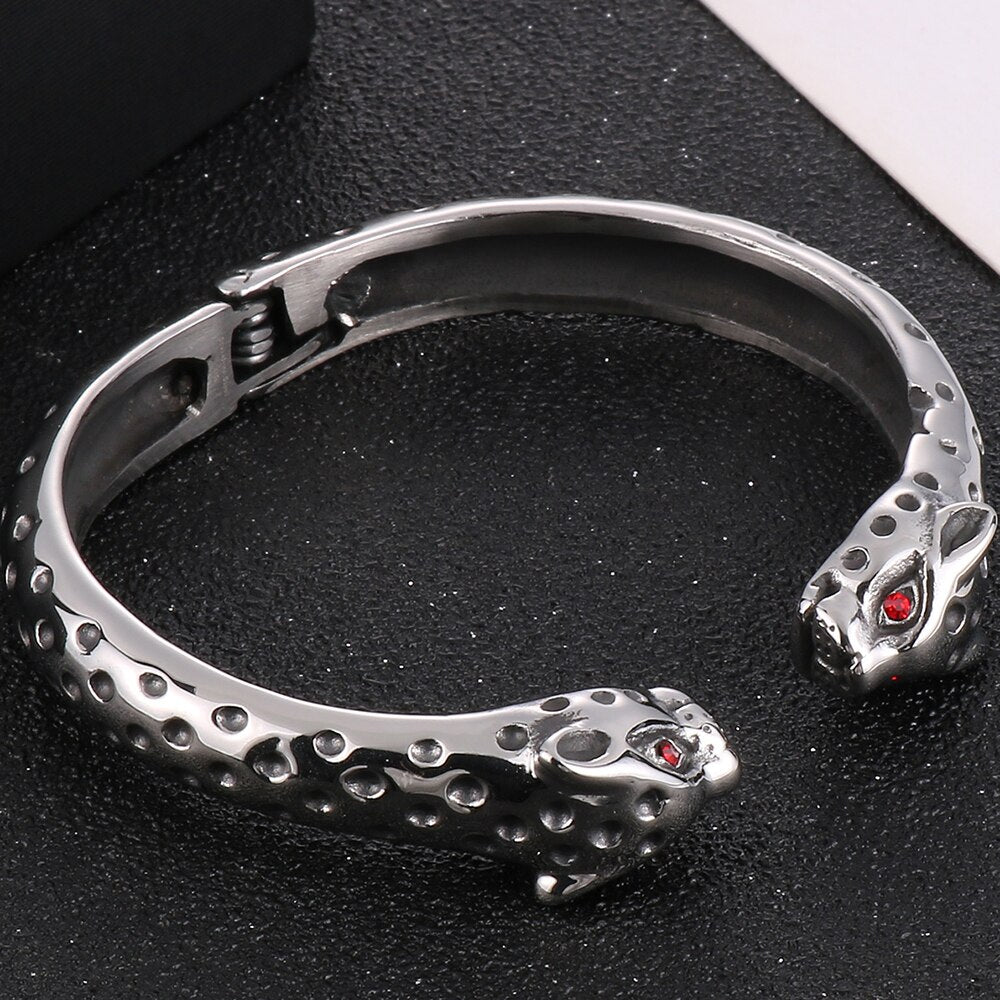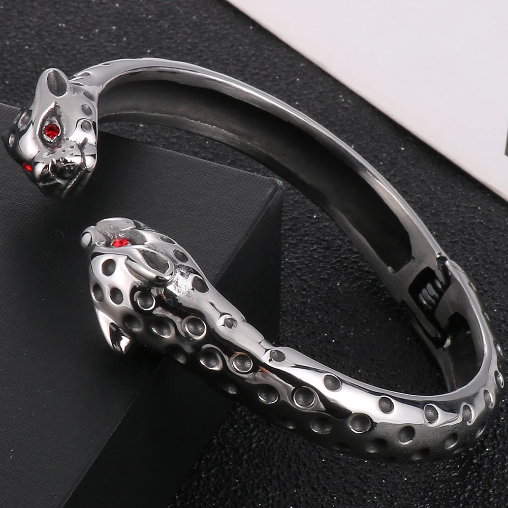 Brazalete abierto de acero inoxidable con cabeza de leopardo y ojos rojos para hombre. Accesorios de joyería rockeros.