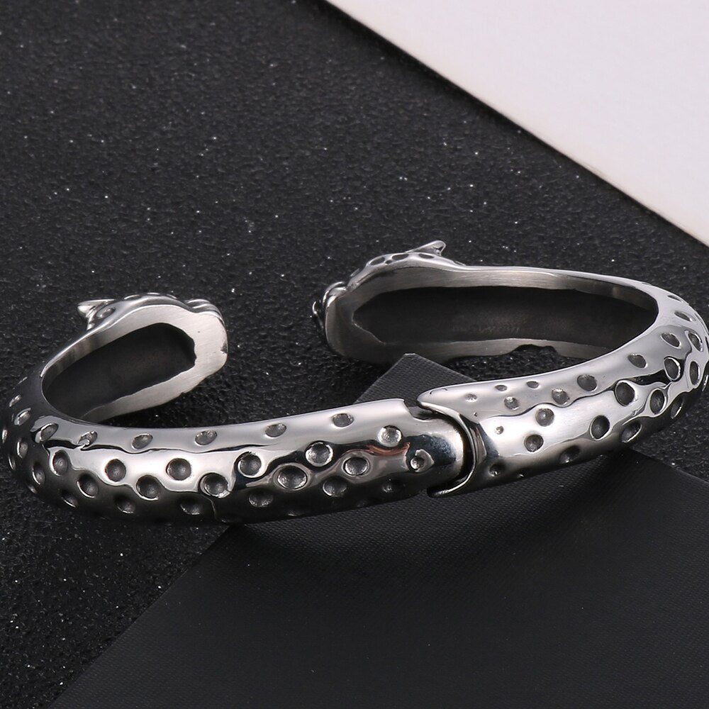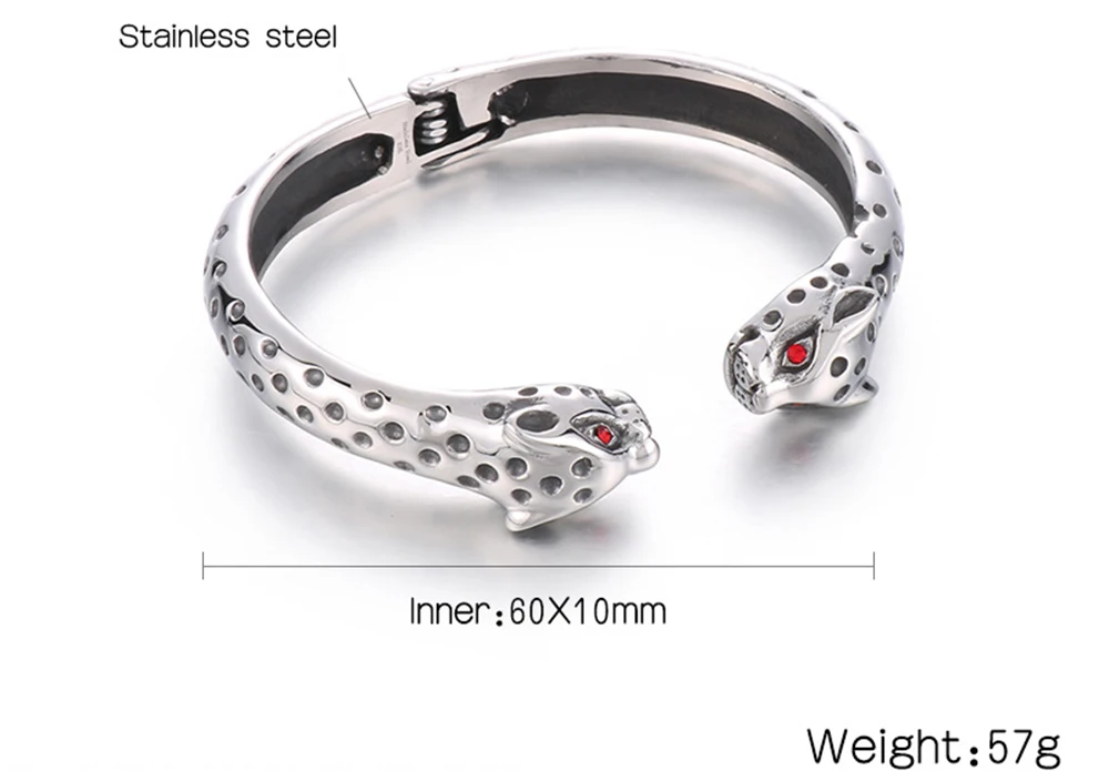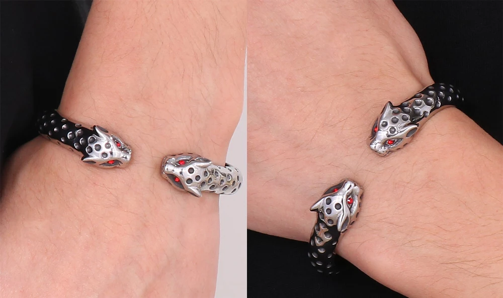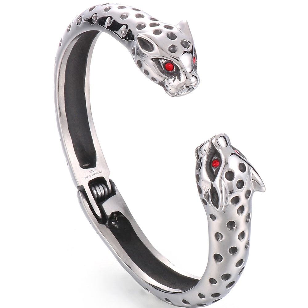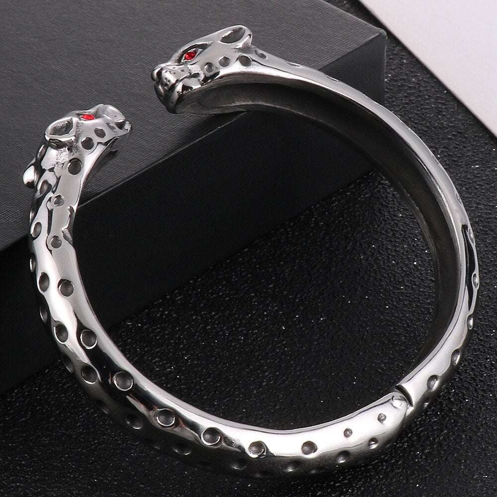 Brazalete abierto de acero inoxidable con cabeza de leopardo y ojos rojos para hombre. Accesorios de joyería rockeros.