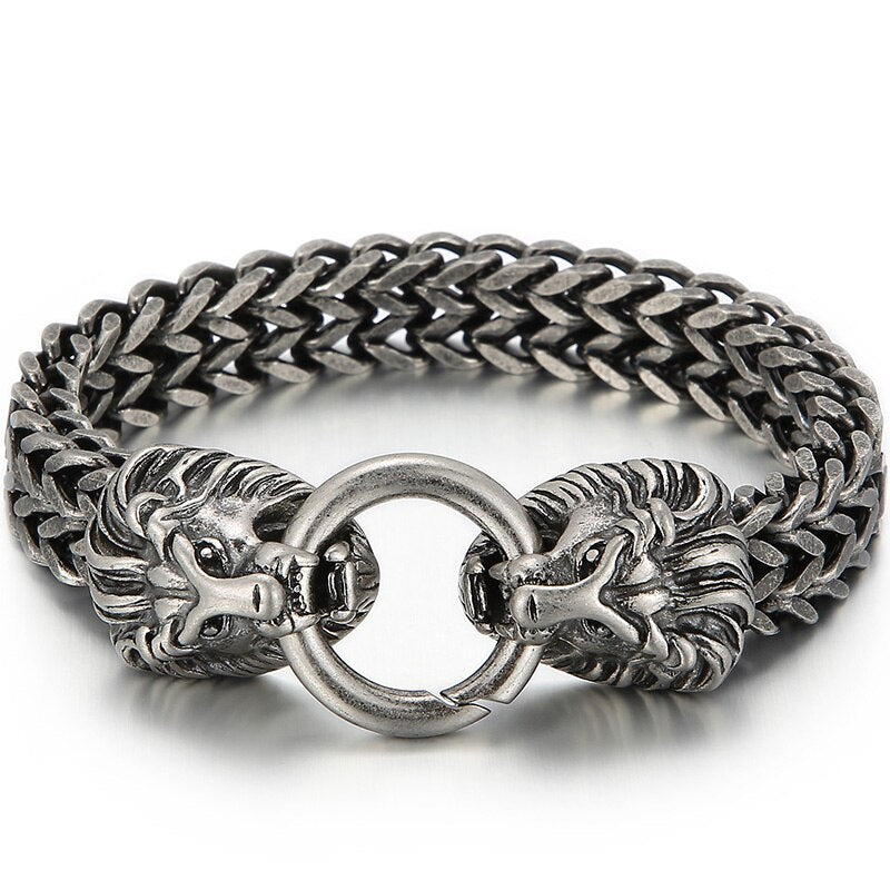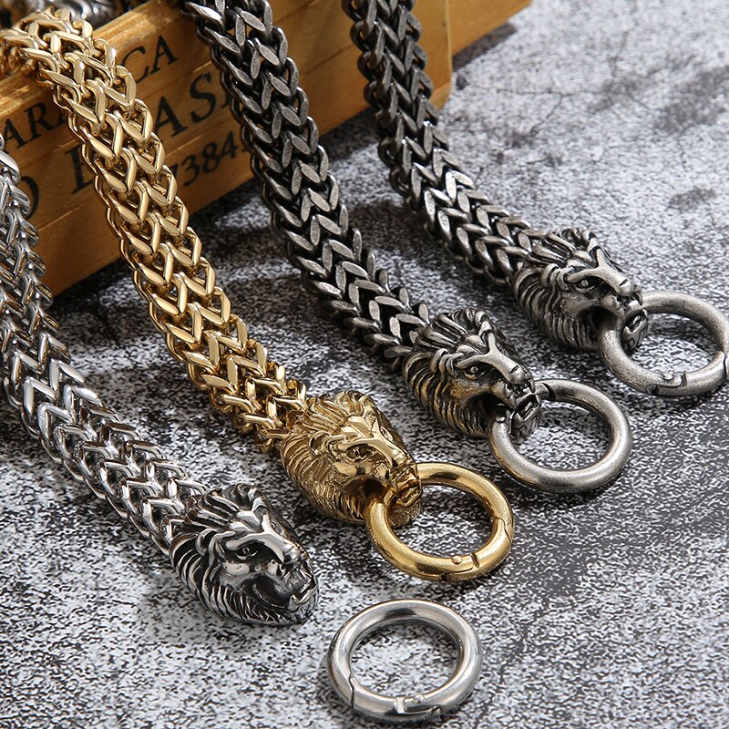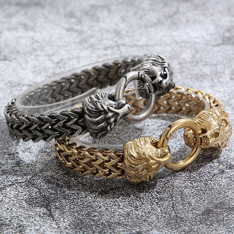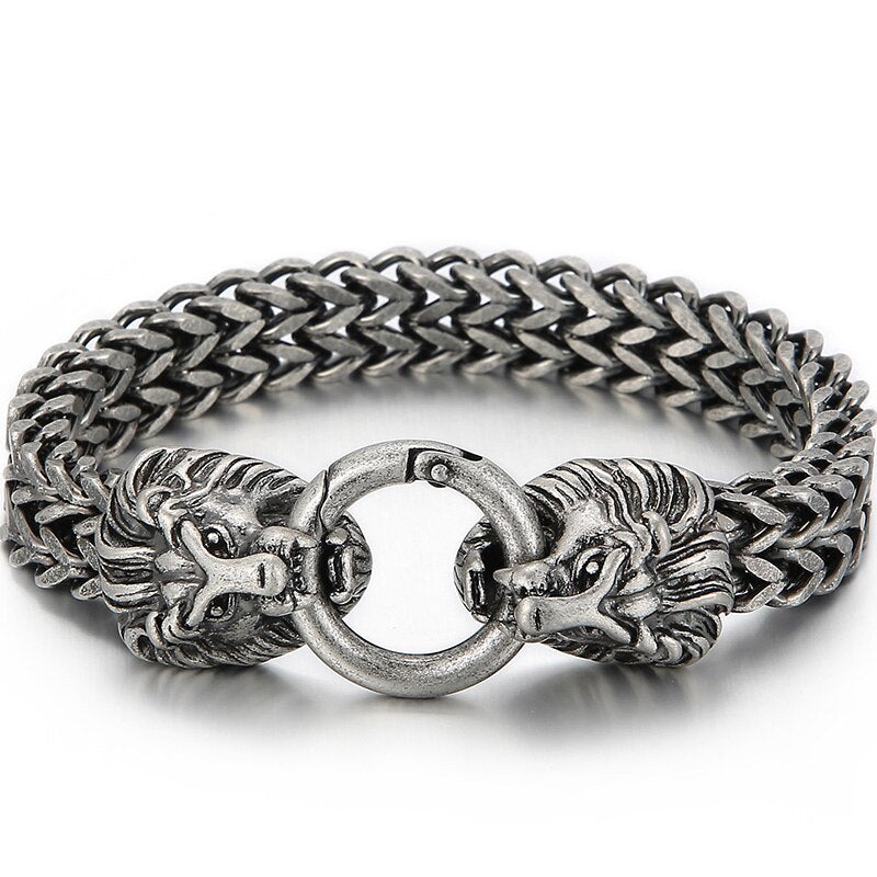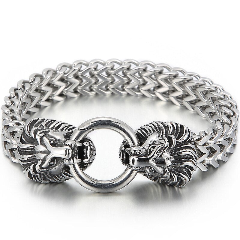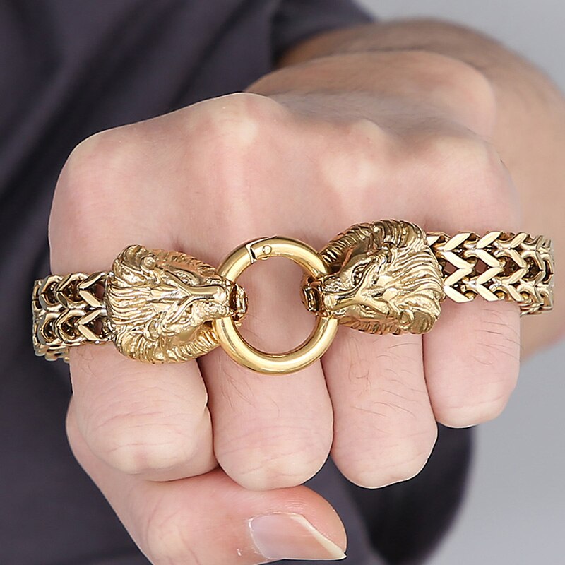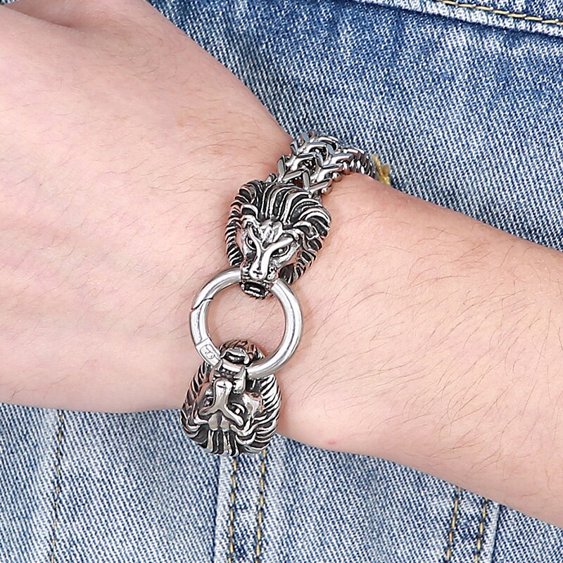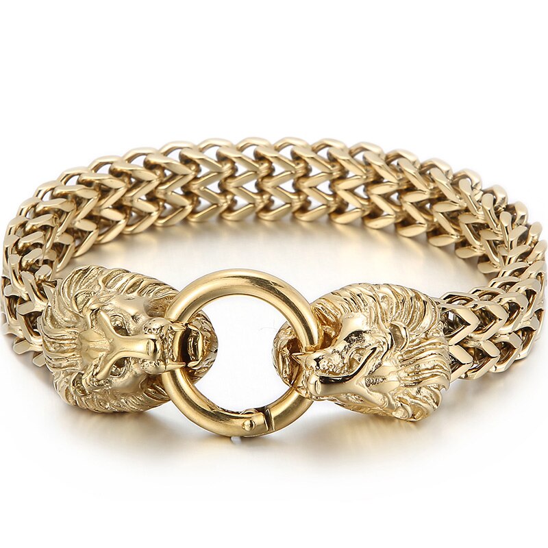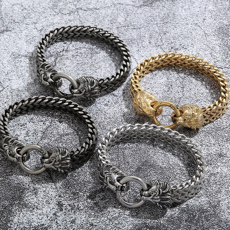 Pulsera para hombre con cadena de eslabones dobles de cabeza de león de 12 mm