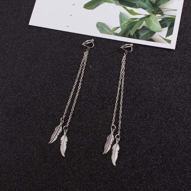 Pendientes de clip con plumas de aleación de cadena larga sin perforaciones para mujer