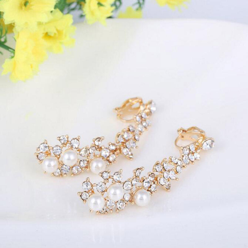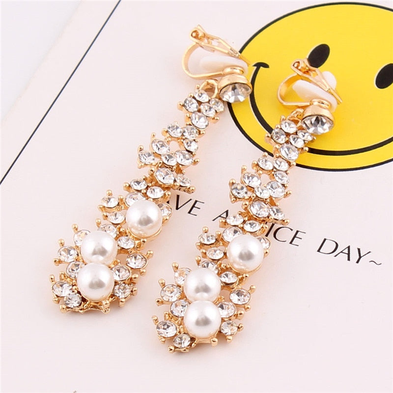 Pendientes largos de clip con perlas de imitación de diamantes de imitación sin perforación para mujer