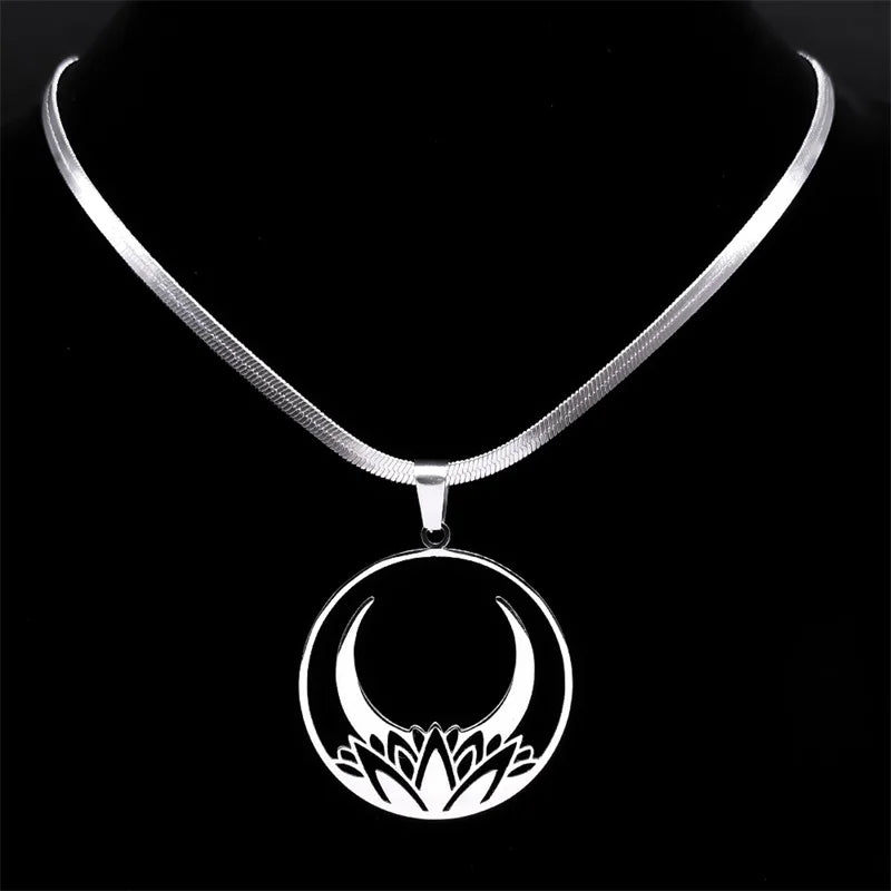 Collar con colgante de flor de loto en forma de media luna para mujer y hombre, de acero inoxidable, color plata, cadena de luna, gargantilla, amuleto, joyería