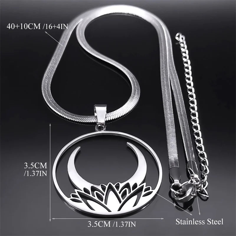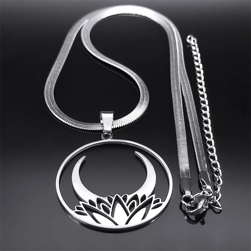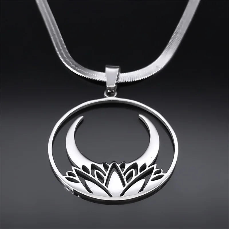 Collar con colgante de flor de loto en forma de media luna para mujer y hombre, de acero inoxidable, color plata, con cadena lunar.