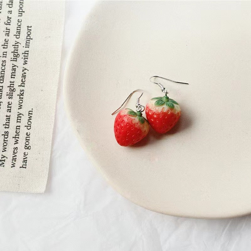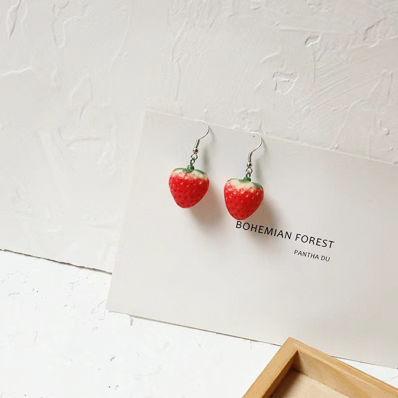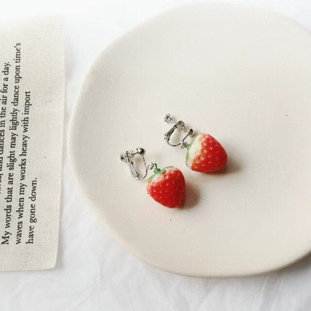 Pendientes de moda: temperamento coreano, sencillos, dulces y encantadores, pendientes de fresa con forma de fruta, pendientes de resina, acrílicos, sin perforaciones, pendientes de clip para mujer.