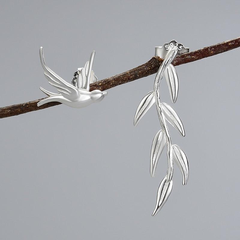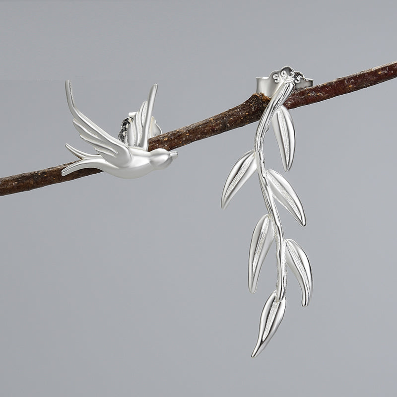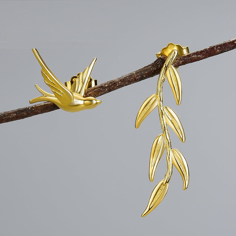 Pendientes de moda - Lujosos pendientes colgantes asimétricos con forma de rama de sauce y golondrina en oro de 18 quilates para mujer, joyería fina de plata de ley 925.