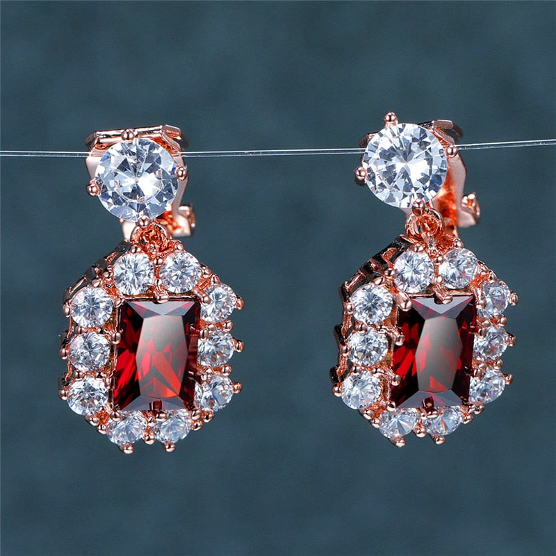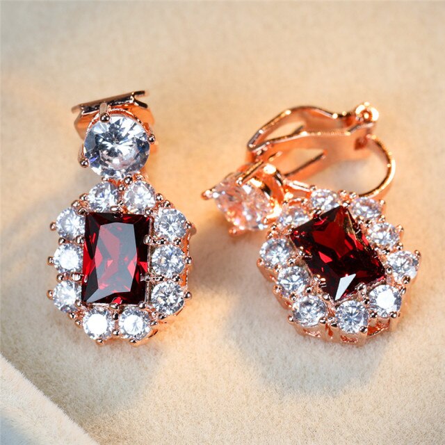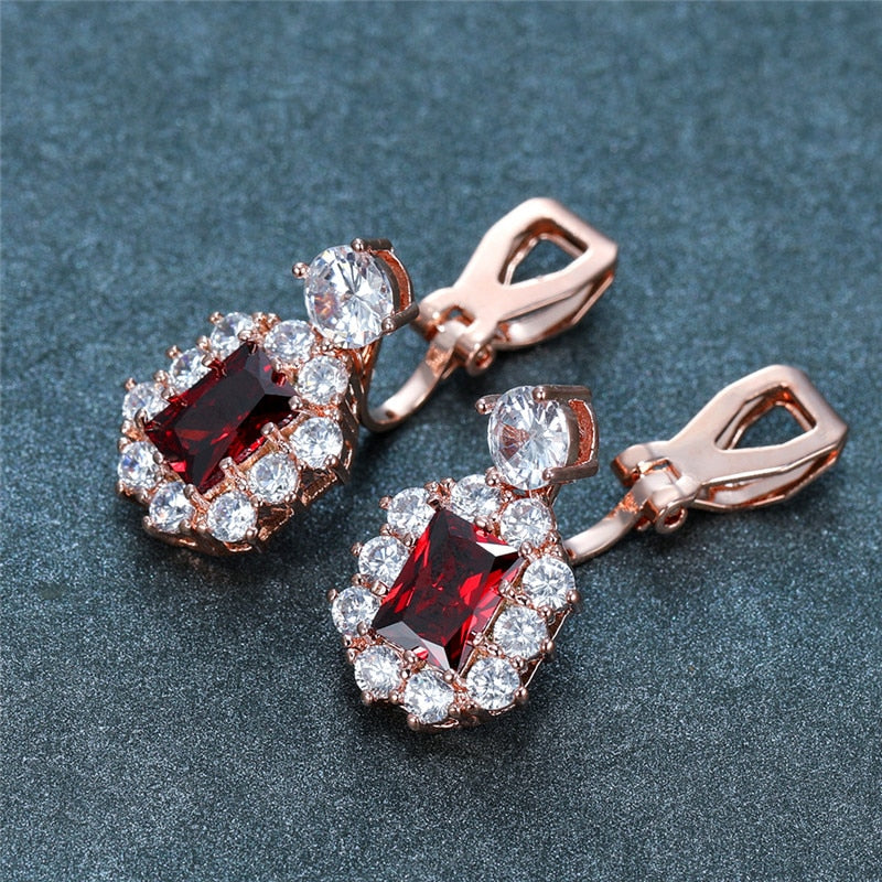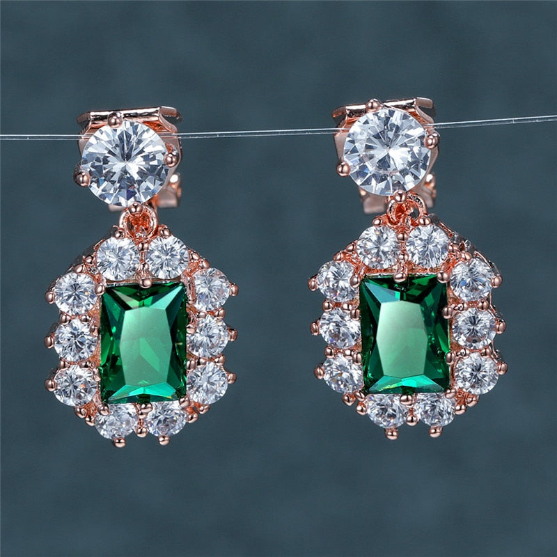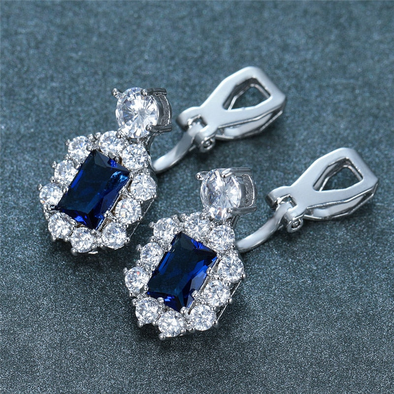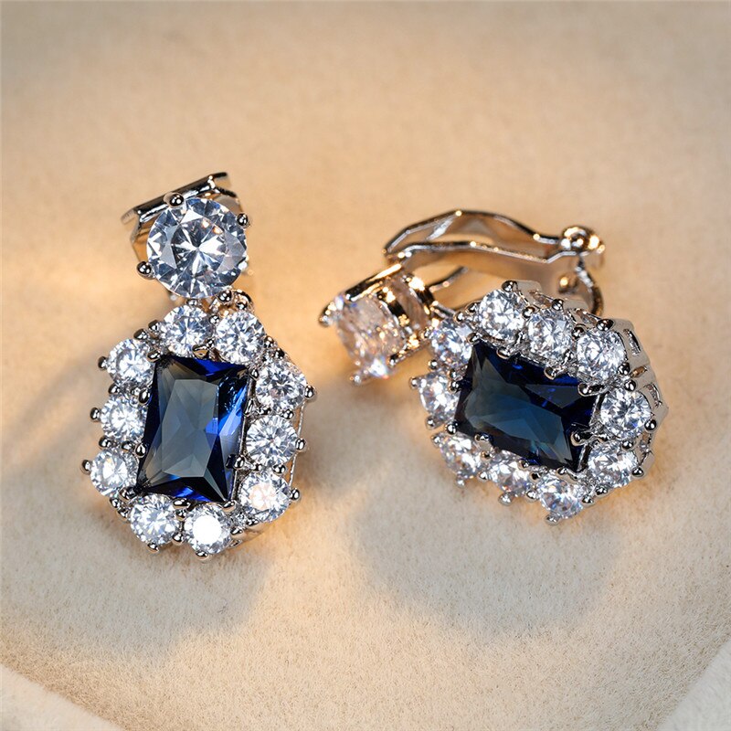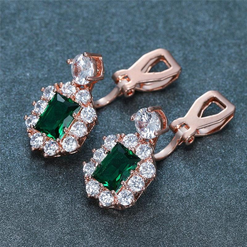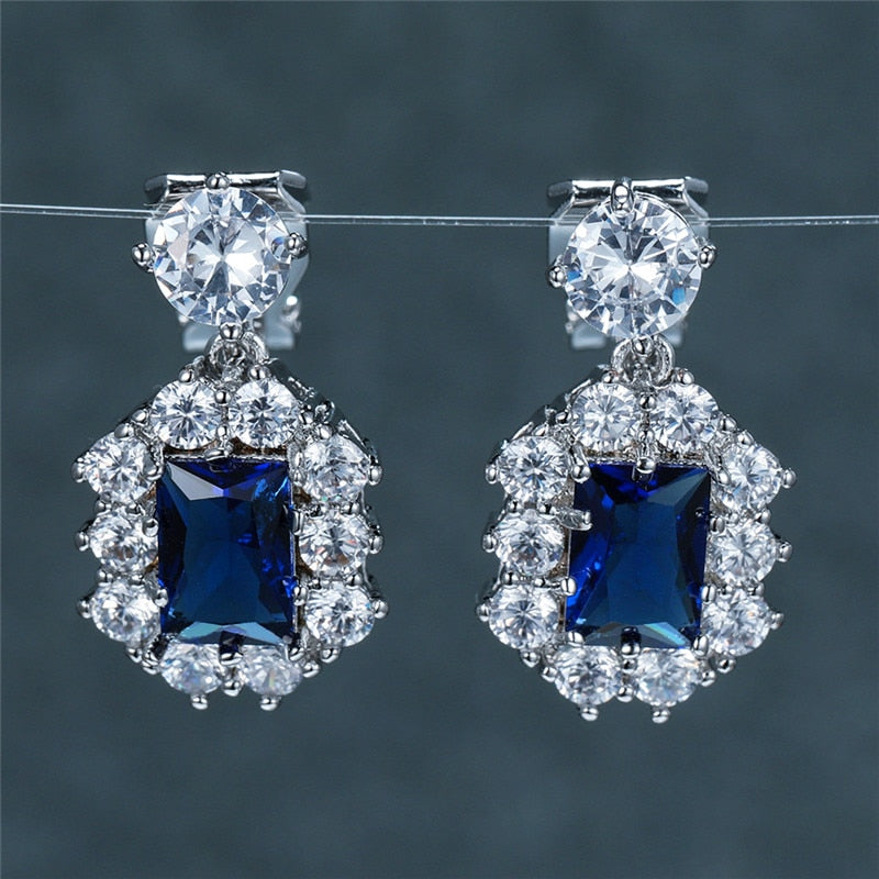 Pendientes de moda: lujosos pendientes de clip de cristal verde para mujer, pendientes de plata con dijes para mujer, pendientes de boda con piedra de circonita azul y roja.