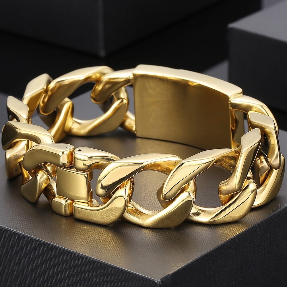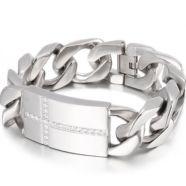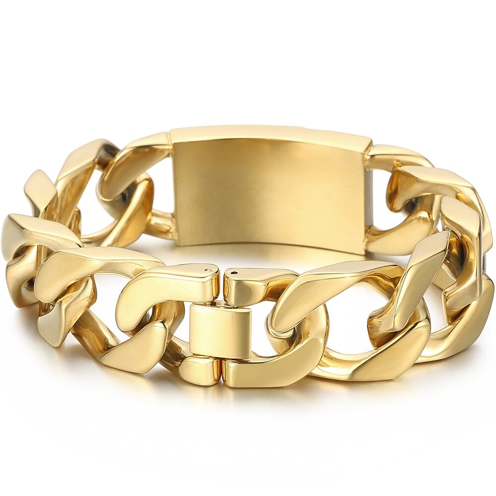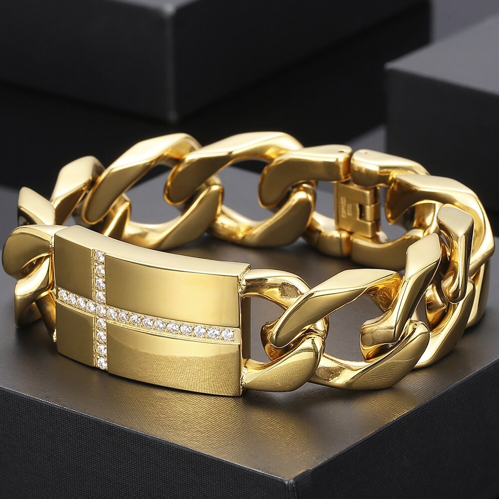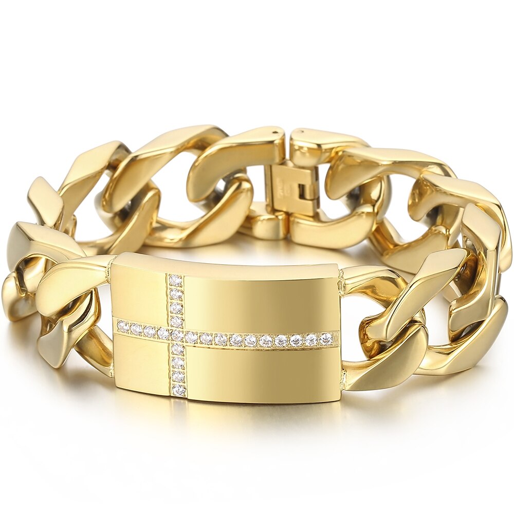 Pulsera de acero inoxidable chapada en oro de lujo para hombre, con cruz, cadena cubana de 20 mm, ideal como regalo cristiano.
