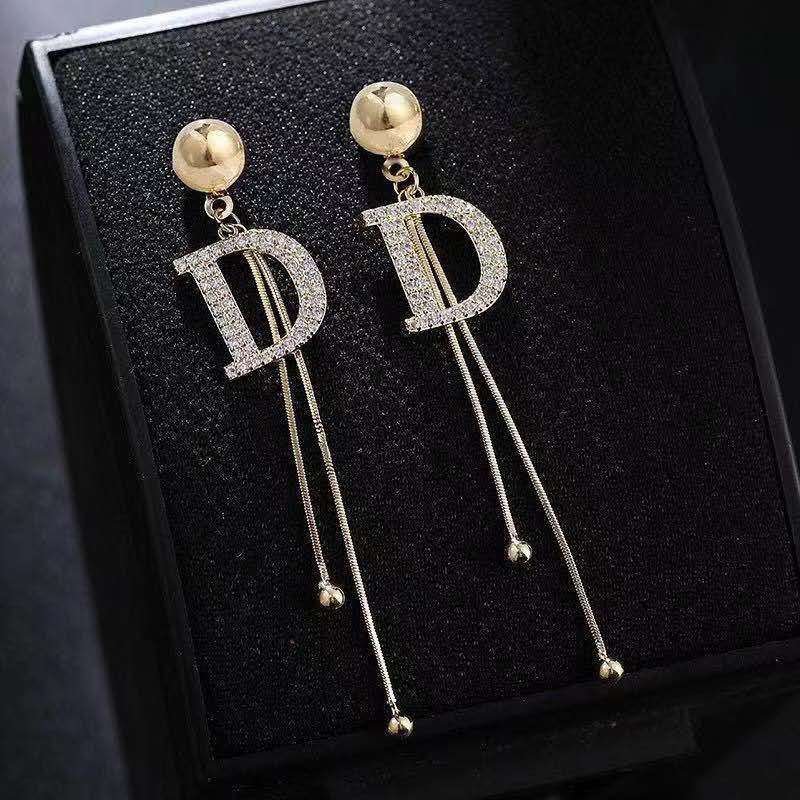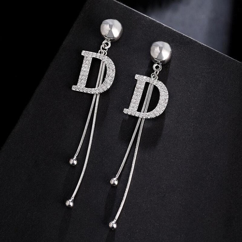 Pendientes de moda de marca de lujo con cadena larga y letra D para mujer, aretes colgantes grandes de cristal, joyería de boda, aretes llamativos.