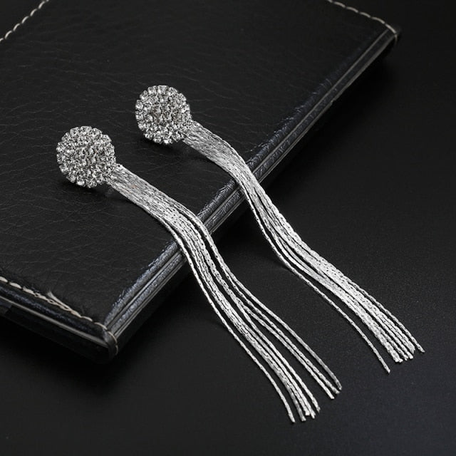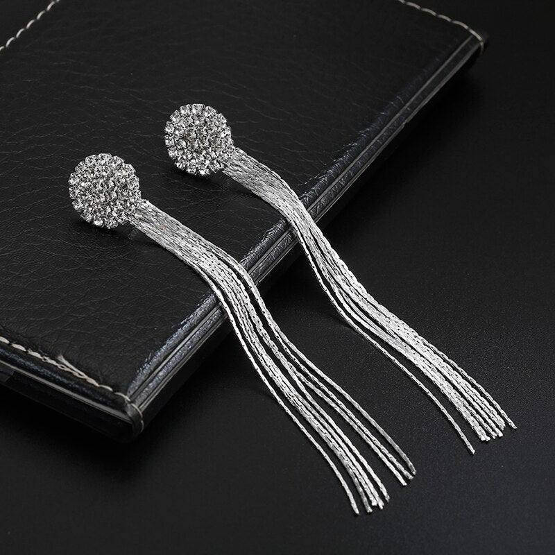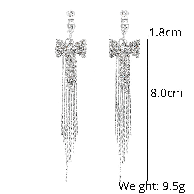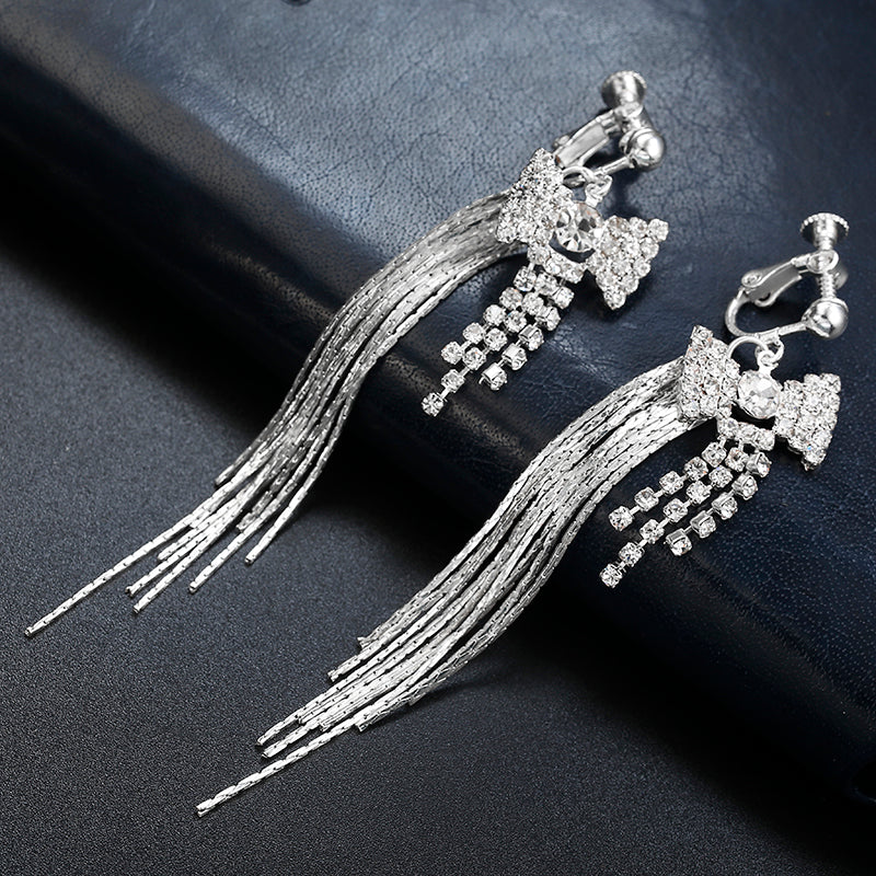 Pendientes largos de plata de lujo con borla y clip para las orejas con diamantes de imitación para mujer