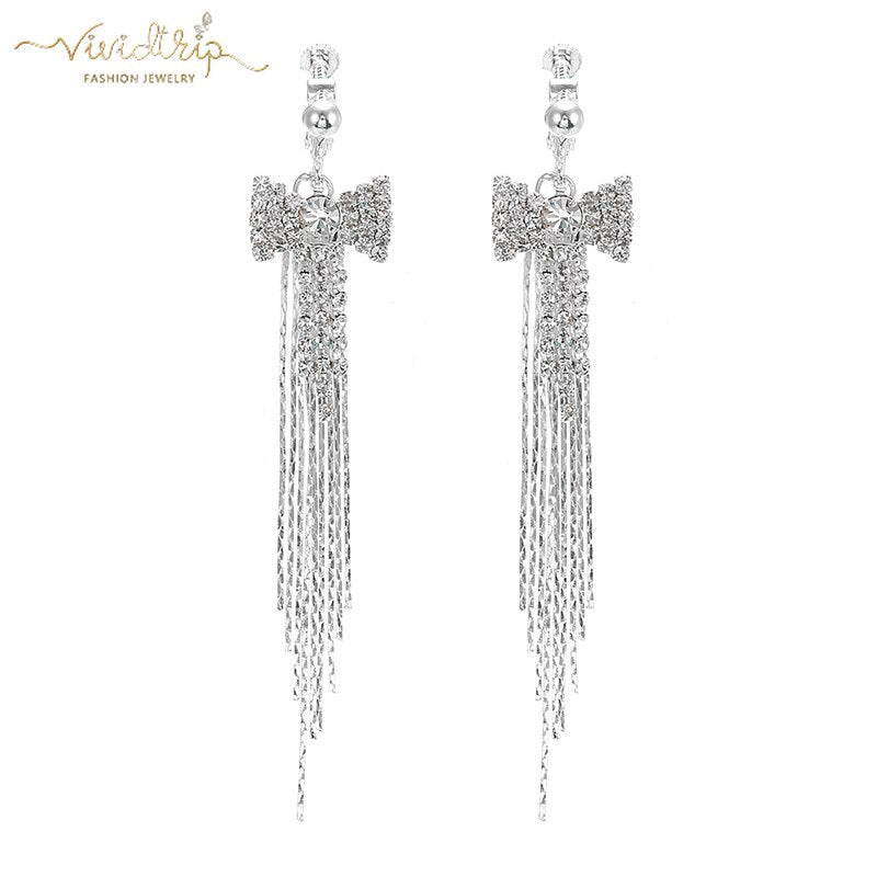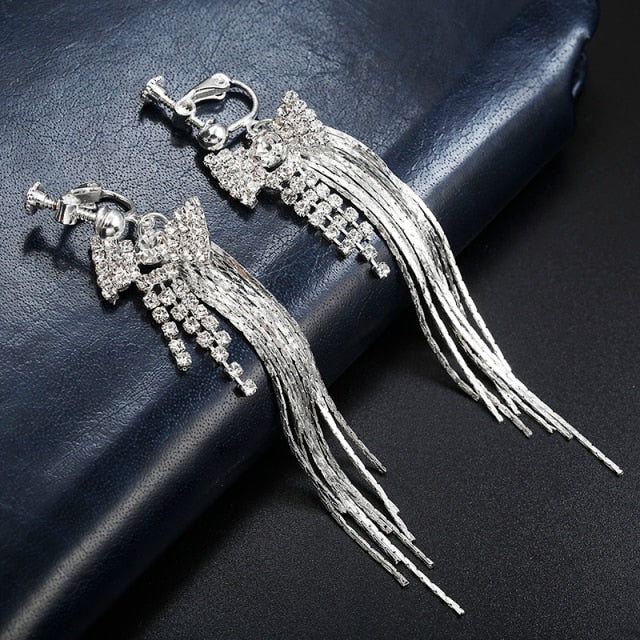 Pendientes de moda de lujo de plata con borla larga y clip para las orejas, con diamantes de imitación, para mujer, sin perforaciones, joyería para bodas y fiestas.