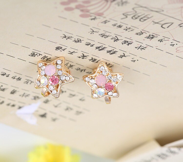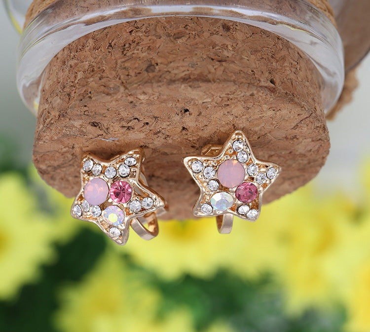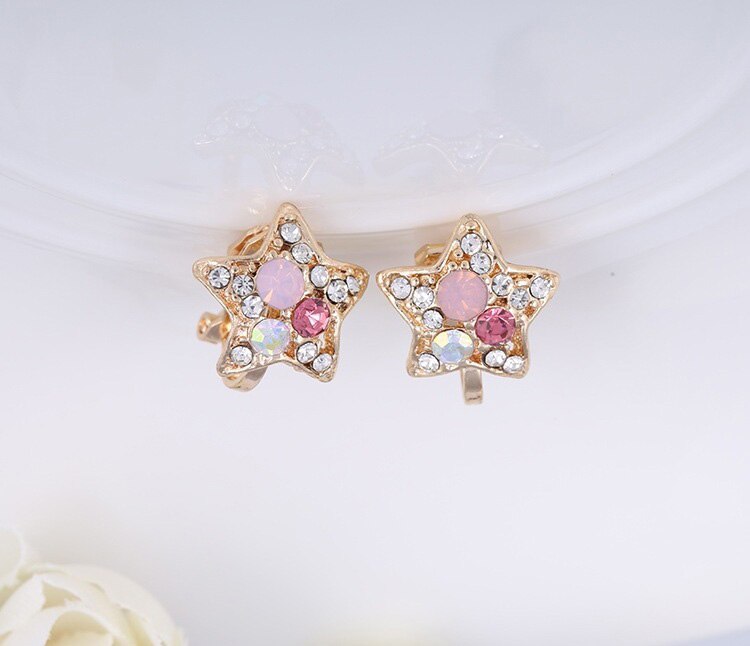 Pendientes de moda: Pendientes de clip de lujo con forma de estrella y diamantes de imitación de colores para mujer, pendientes de clip de cristal dorado sin agujero para boda infantil.