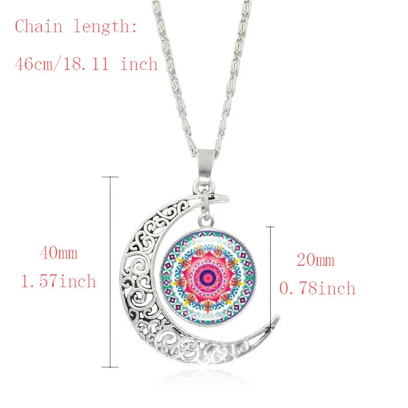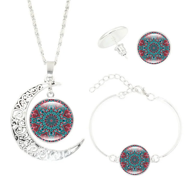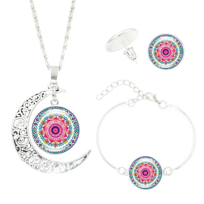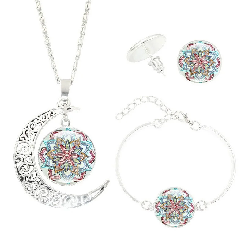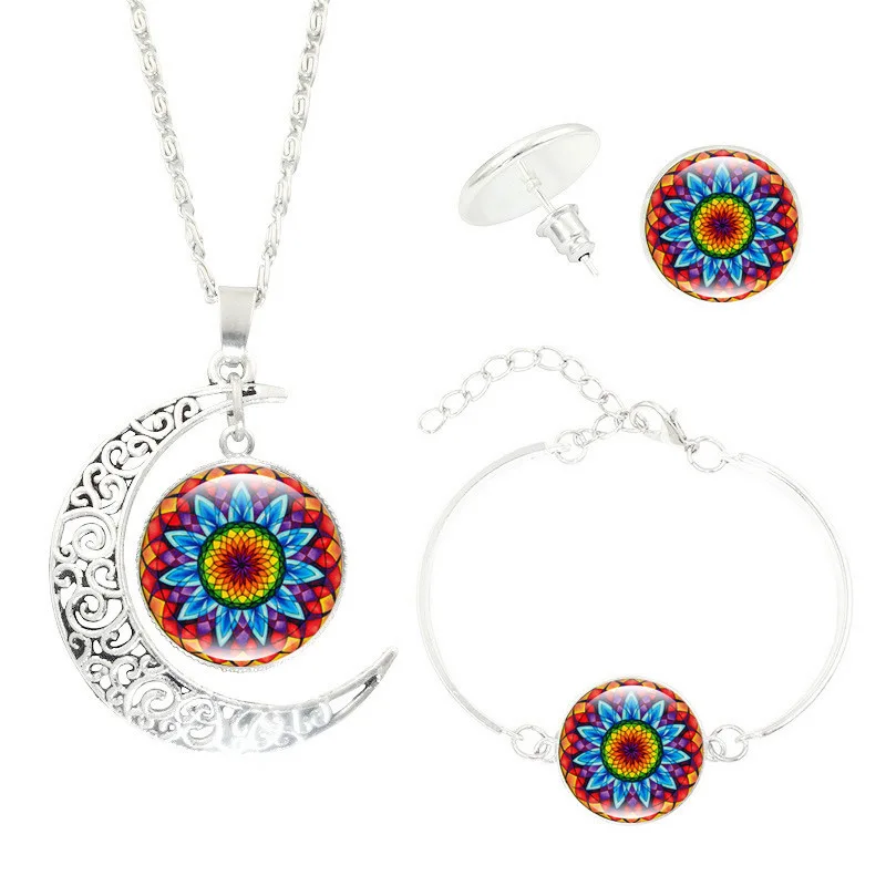 Conjunto de collar, pendientes y pulsera con gemas del tiempo de cristal, luna y flor de mandala.
