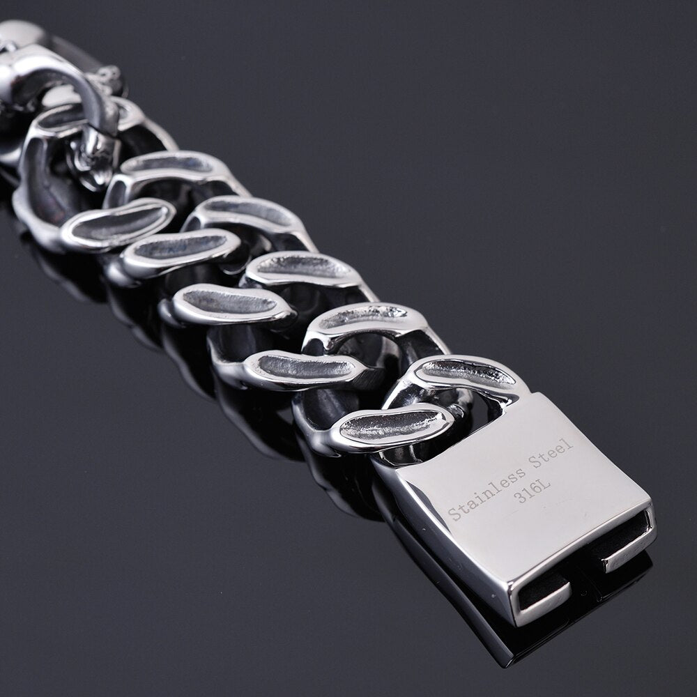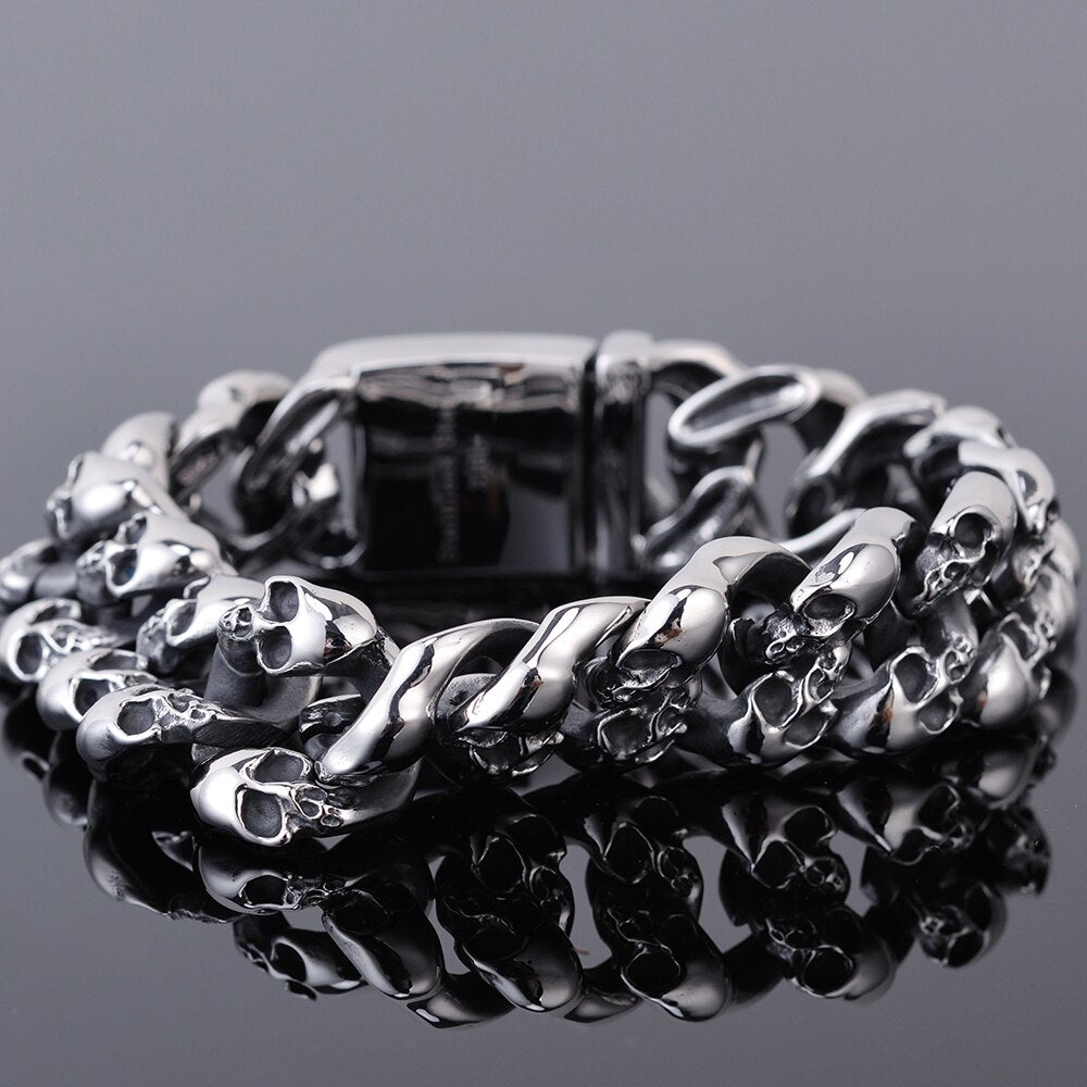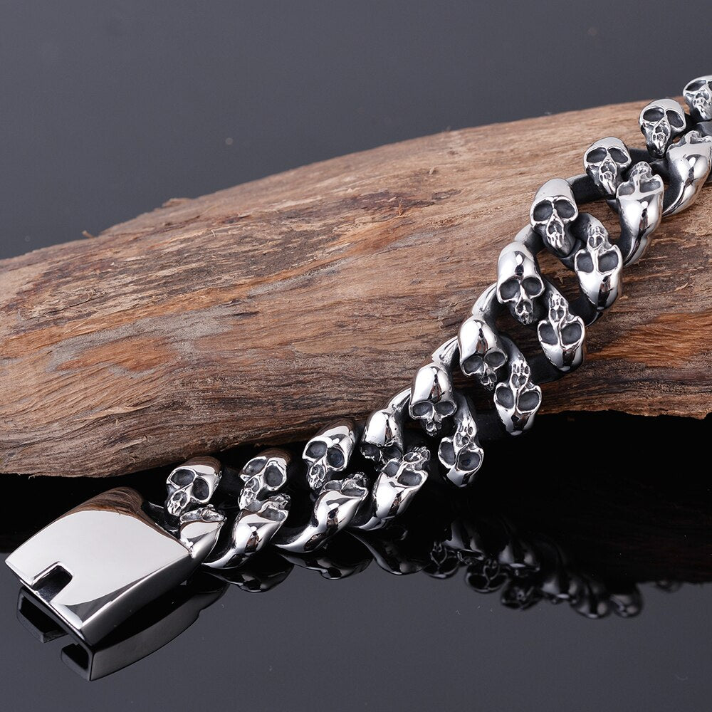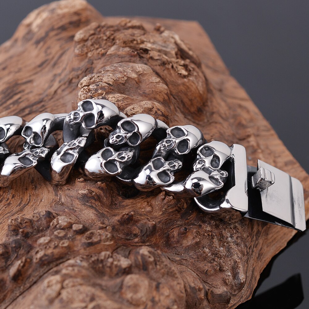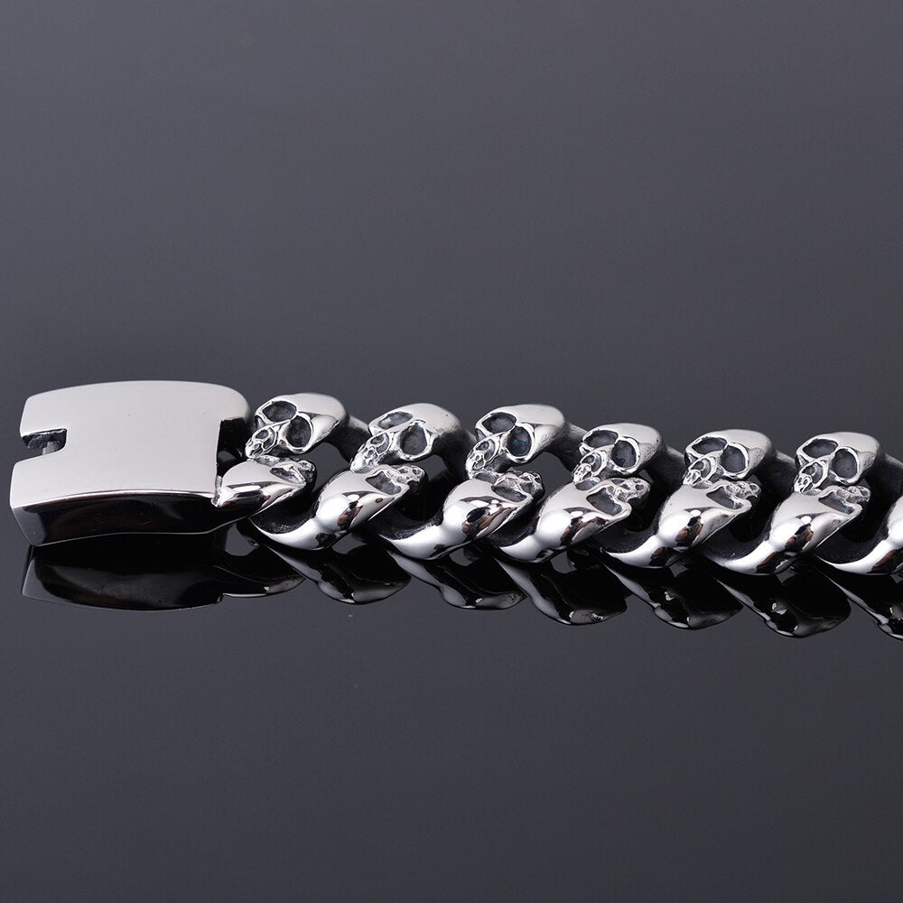 Pulsera de motociclista gótica con calavera de acero inoxidable 316L para hombre, de 19 mm de ancho y cadena de eslabones, con calaveras pulidas.