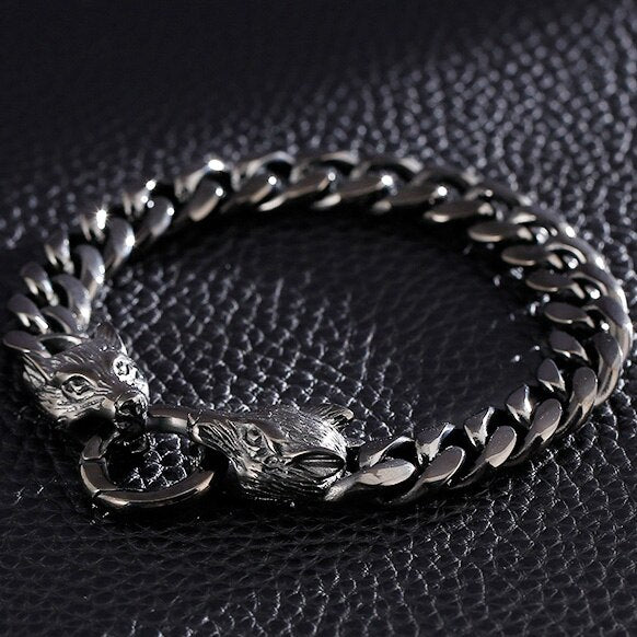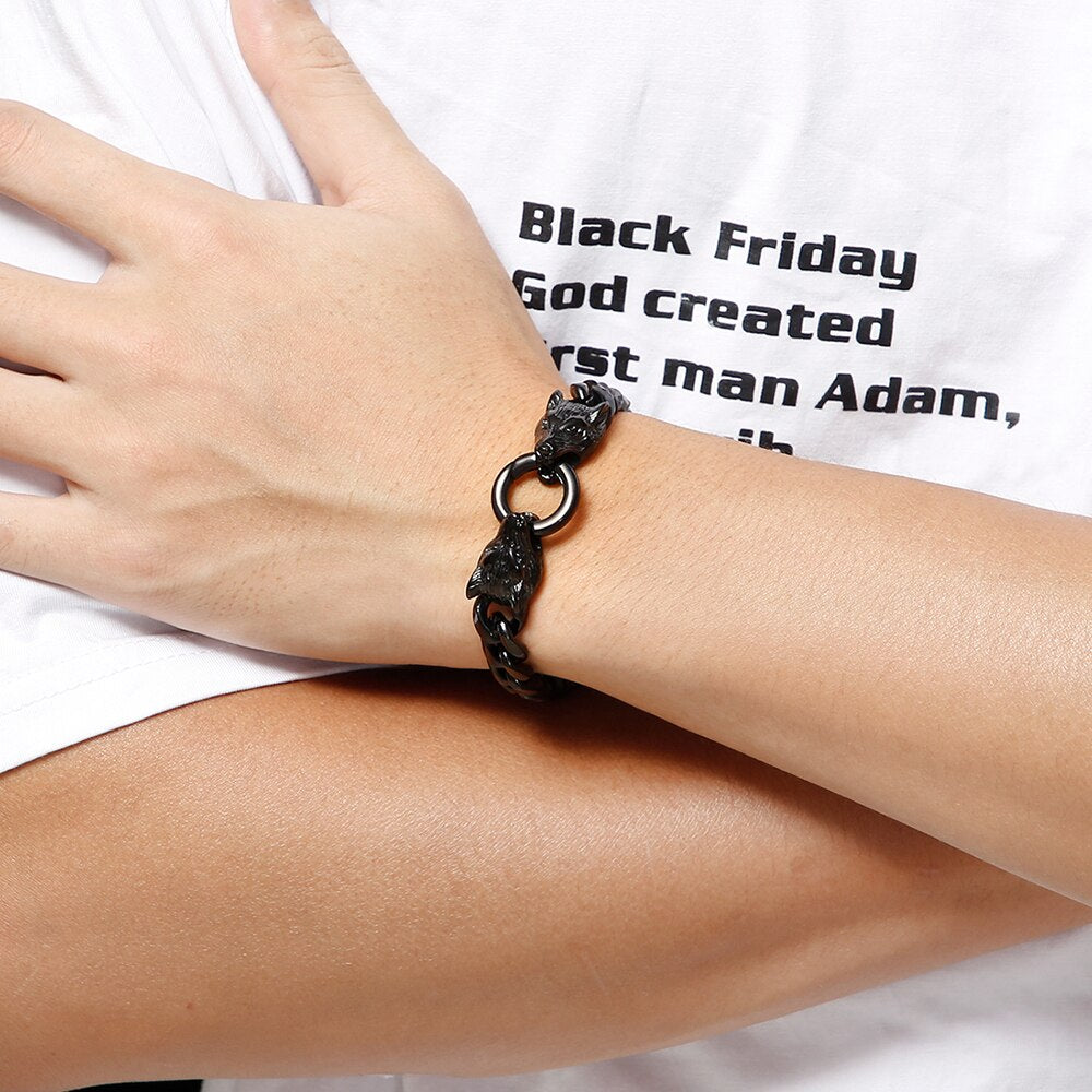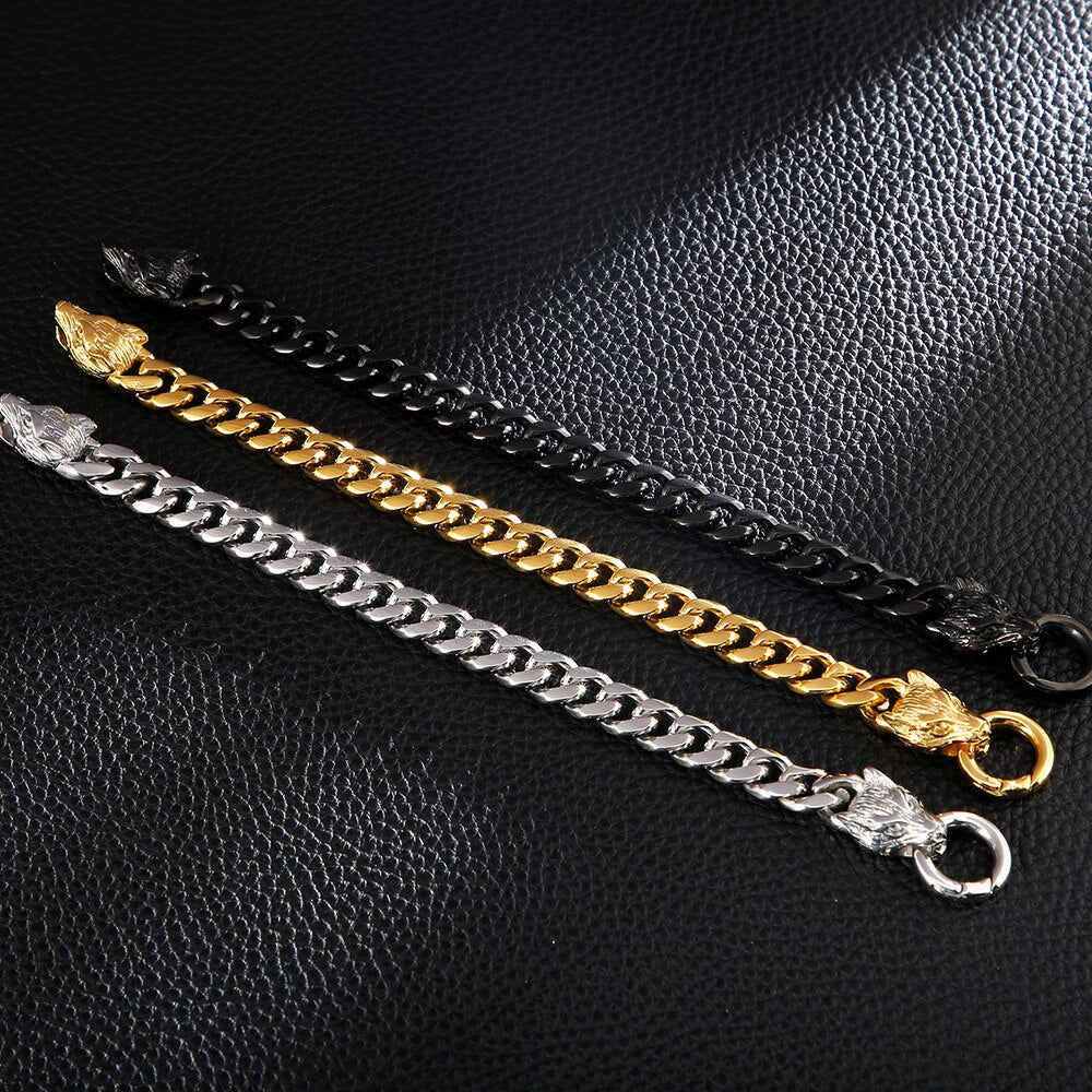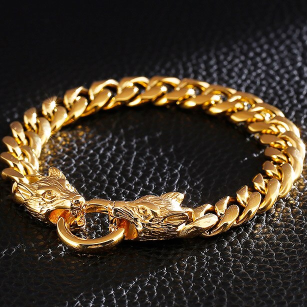 Pulsera de acero inoxidable chapada en oro macizo con doble cabeza de lobo para hombre, cadena cubana, joyería, regalo de fiesta, pulseras para hombre