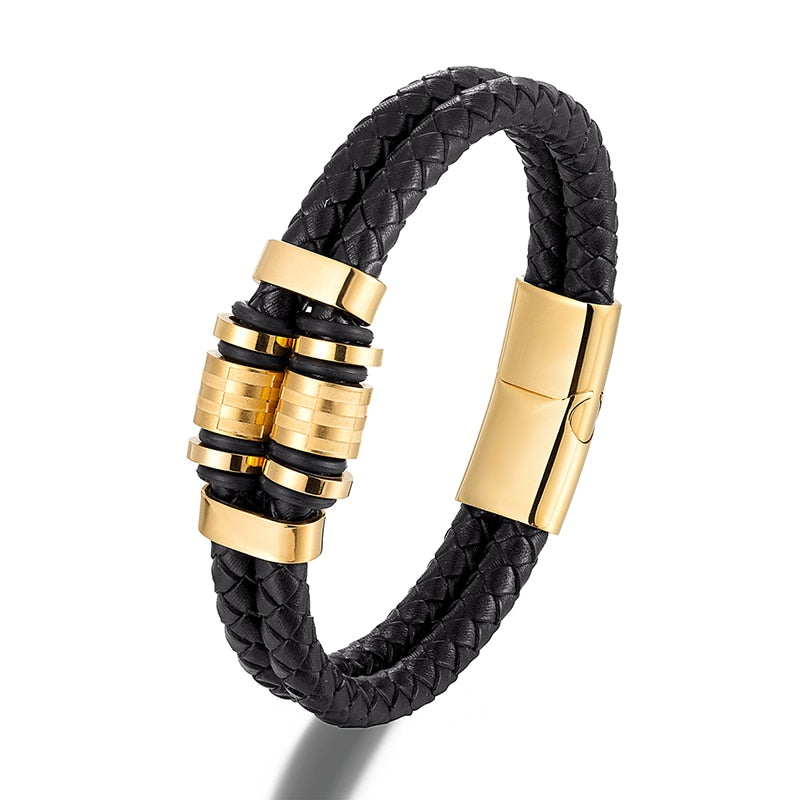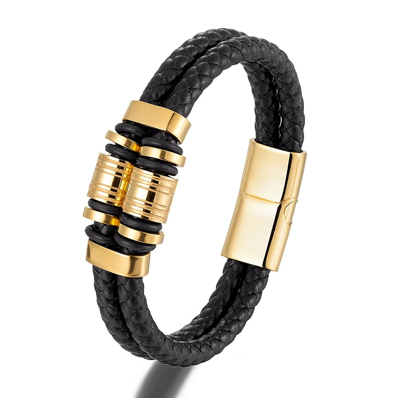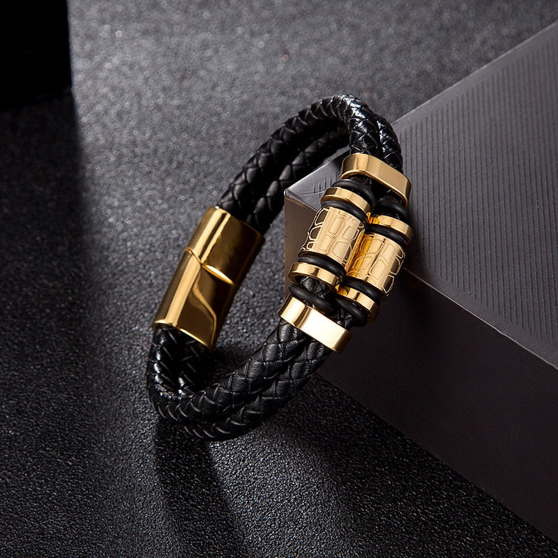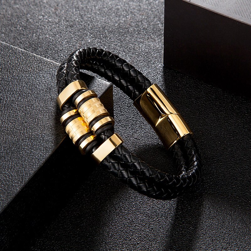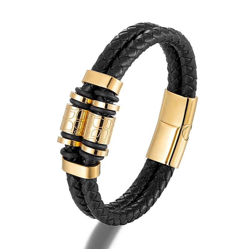 Pulsera de cuero genuino para hombre, joyería de acero inoxidable dorado con dijes, accesorios punk de lujo hechos a mano, regalos para amigos.
