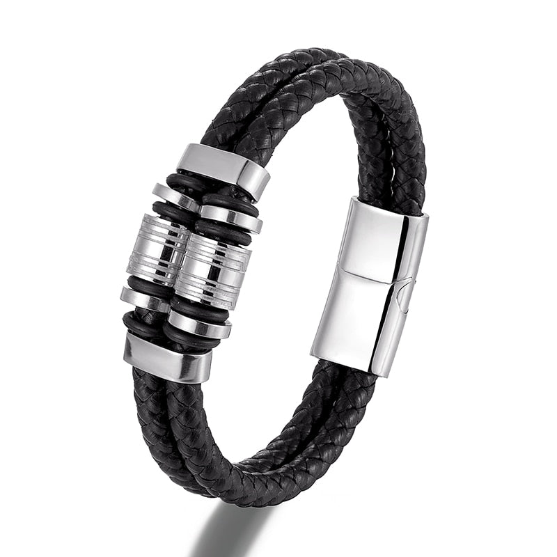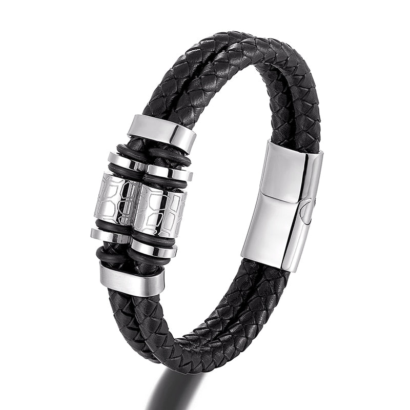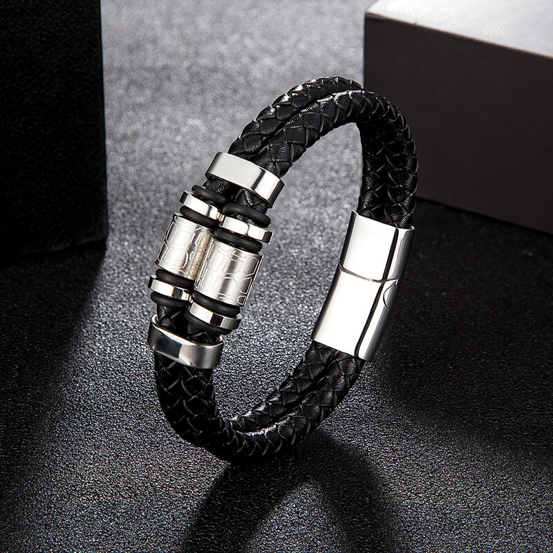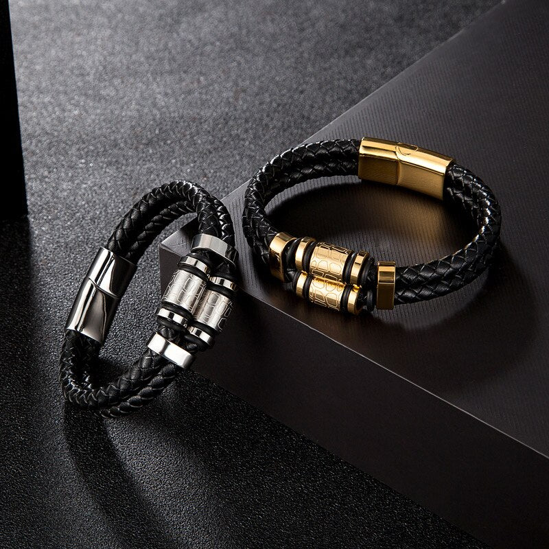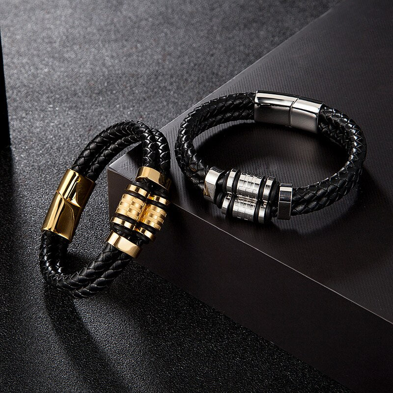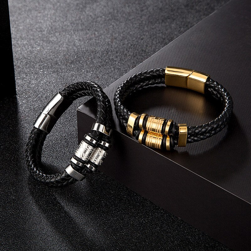 Pulsera de cuero genuino para hombre, joyería de acero inoxidable dorado con dijes, accesorios punk de lujo hechos a mano, regalos para amigos.