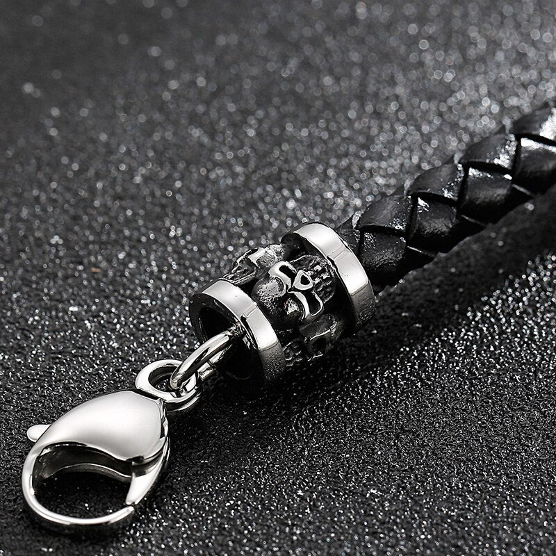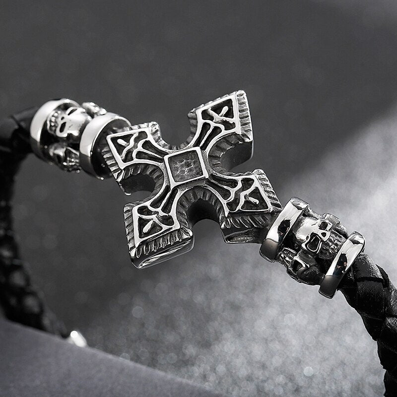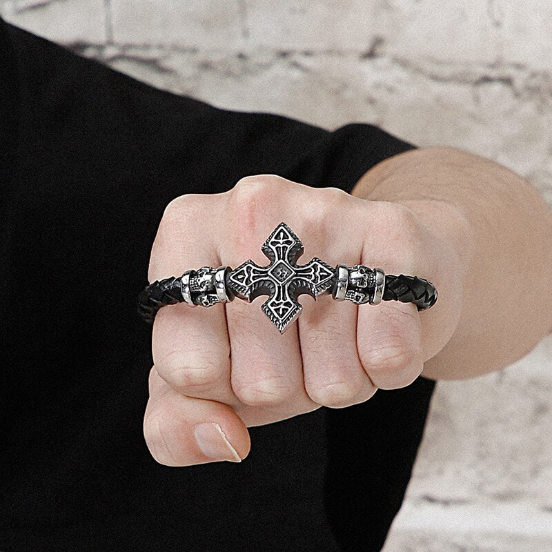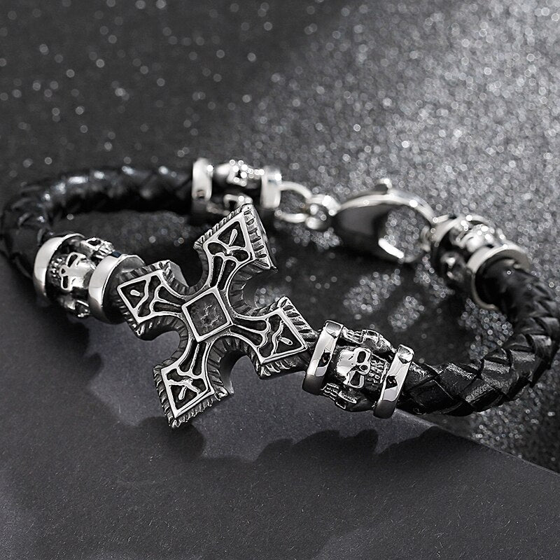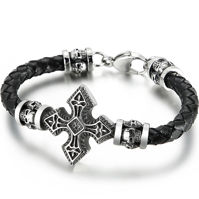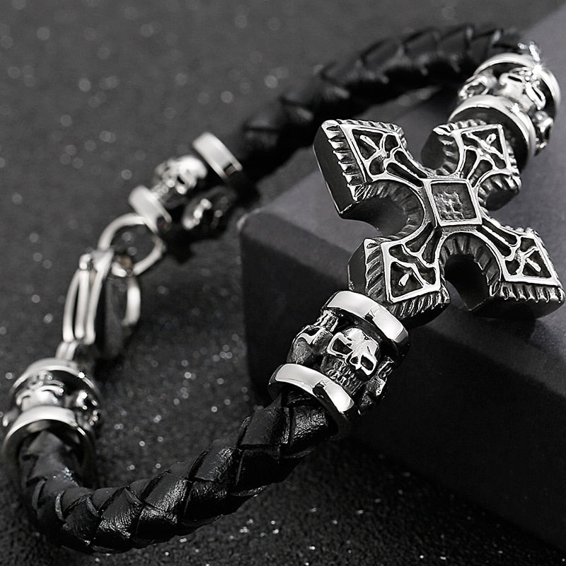 Pulsera de cuero con cruz para hombre: Pulseras de calavera para hombre