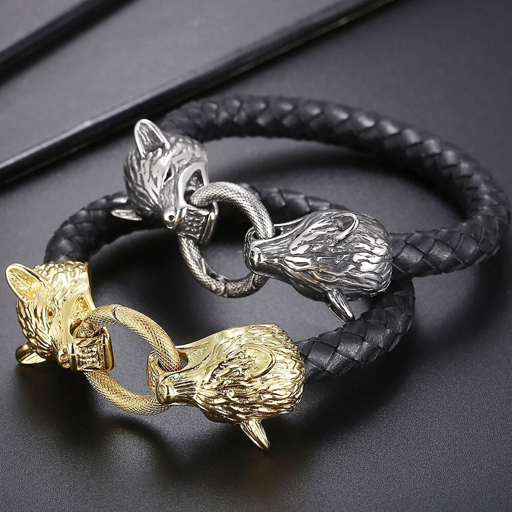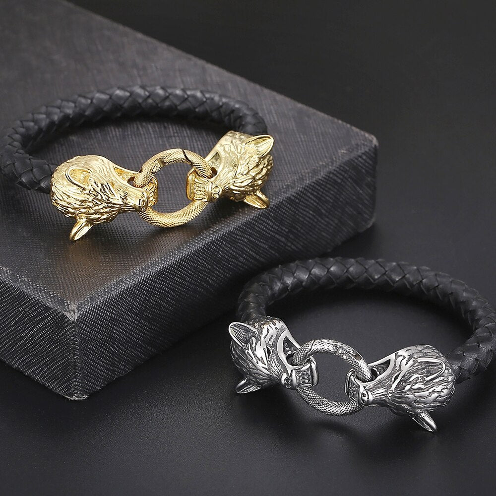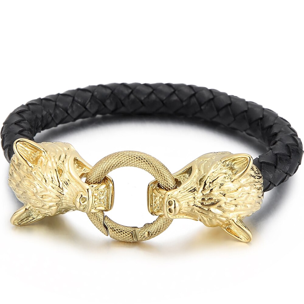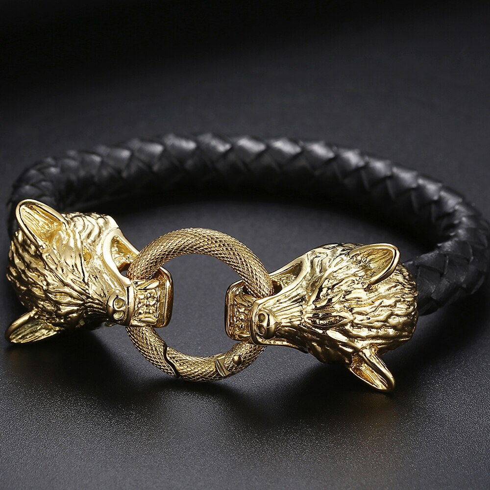 Pulsera de cuero para hombre con doble cabeza de lobo, de lujo, nunca se decolora, chapada en oro, de acero inoxidable 316L, joyería para hombre.