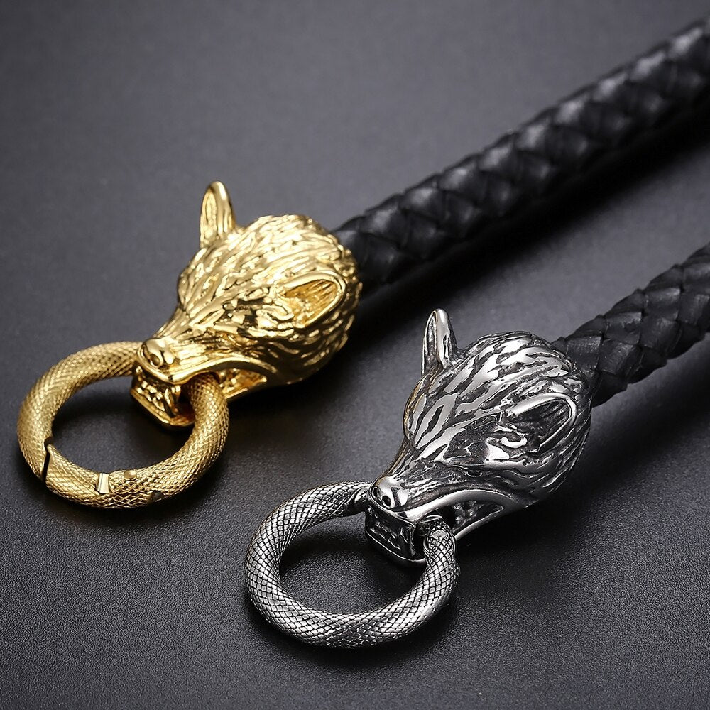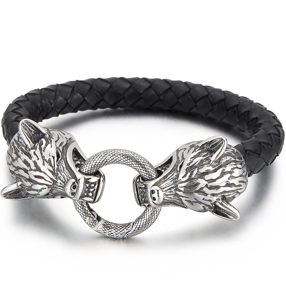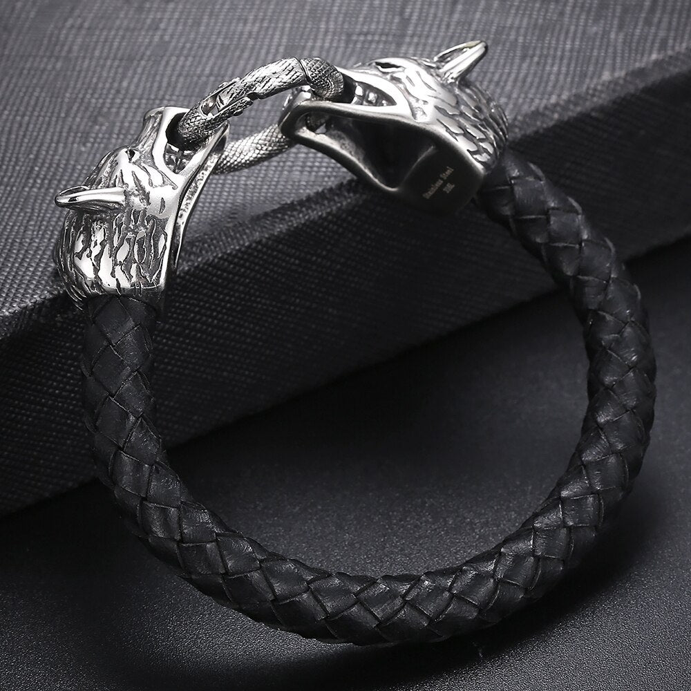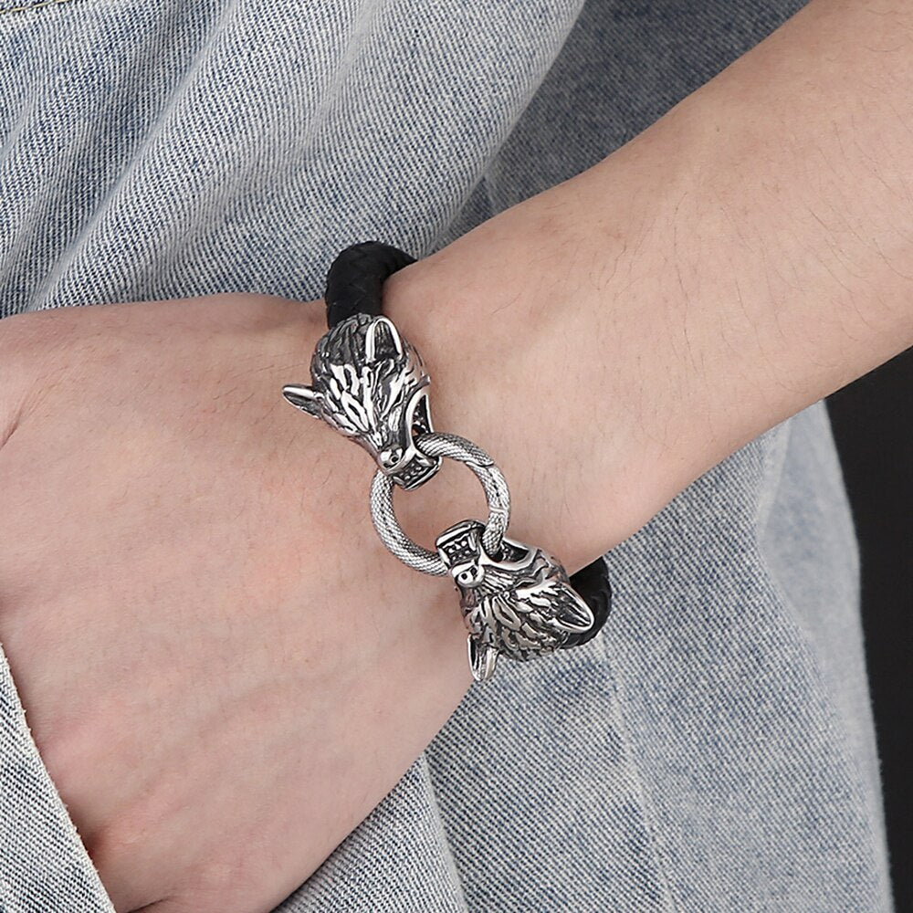 Pulsera de cuero para hombre con doble cabeza de lobo, de lujo, nunca se decolora, chapada en oro, de acero inoxidable 316L, joyería para hombre.