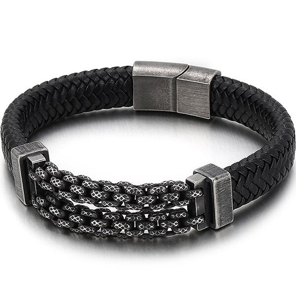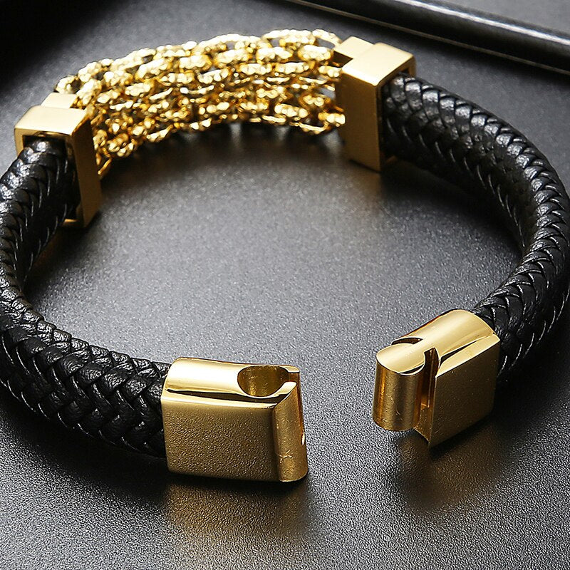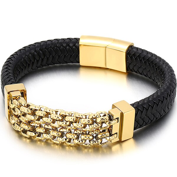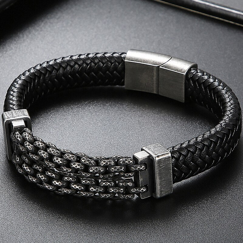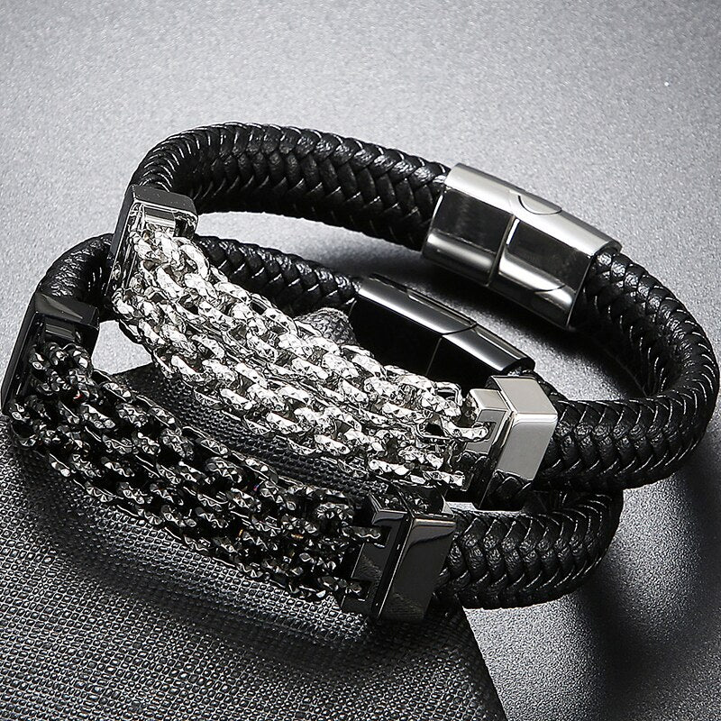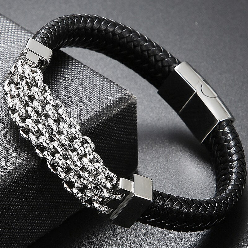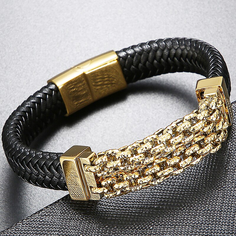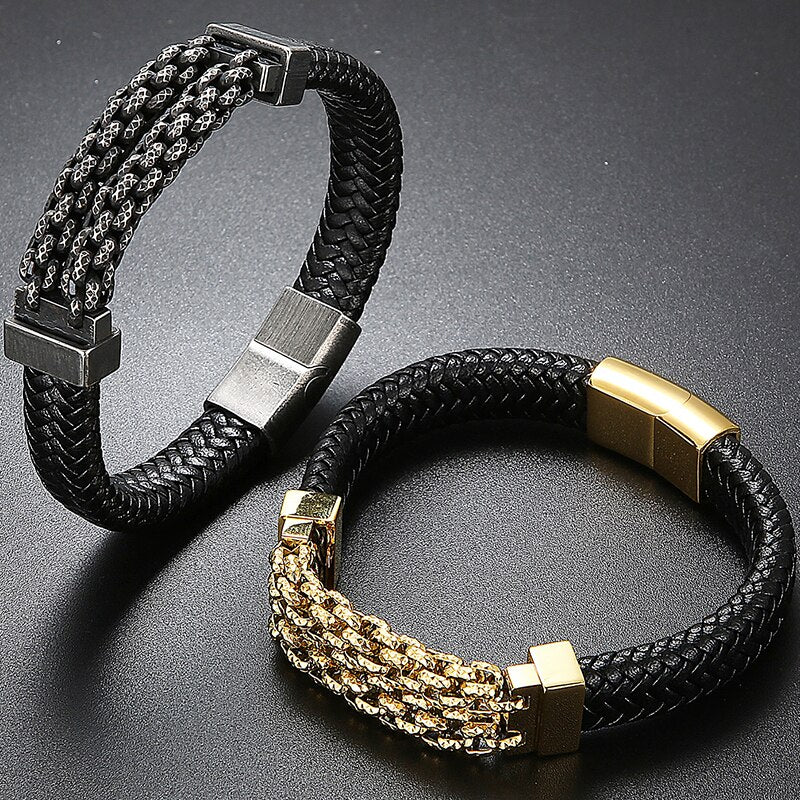 Pulseras de cuero para hombre, brazaletes de acero inoxidable, accesorios de joyería, grabados.