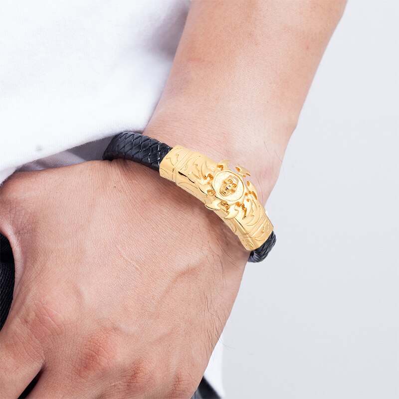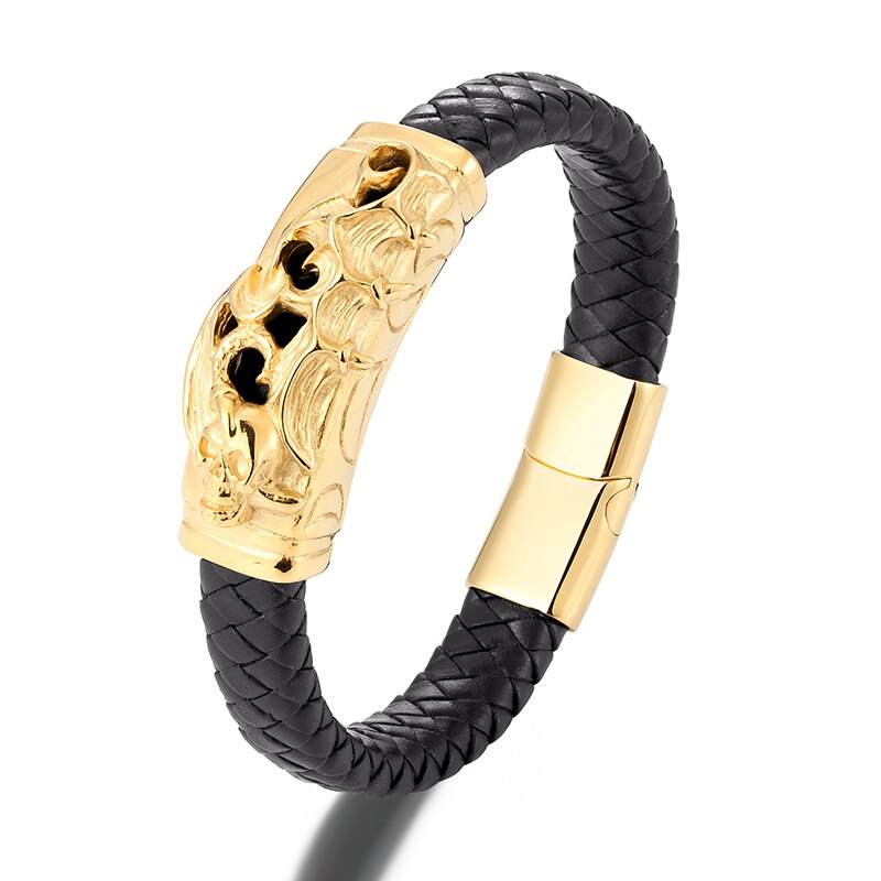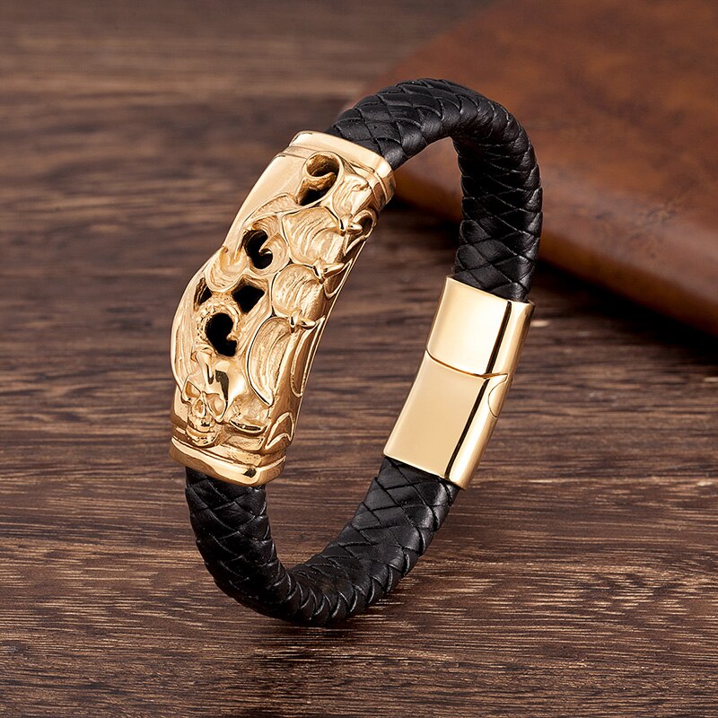 Pulsera para hombre, pulsera punk, pulsera con hebilla magnética, pulsera rock, pulsera de calavera dorada, brazaletes, pulsera de cuero vacuno, accesorios, pulseras con dijes, pulsera de acero inoxidable, joyas, regalos