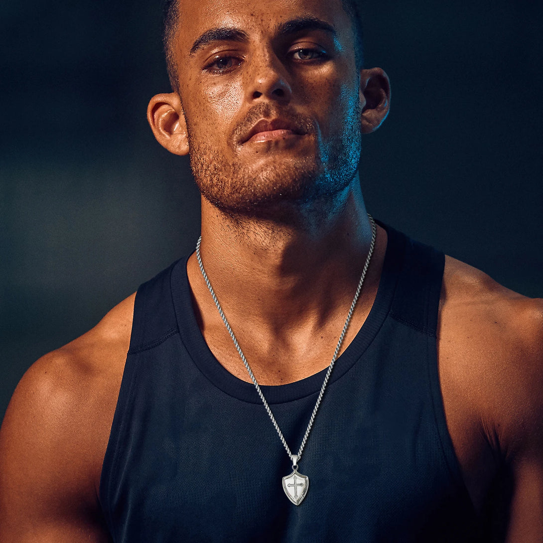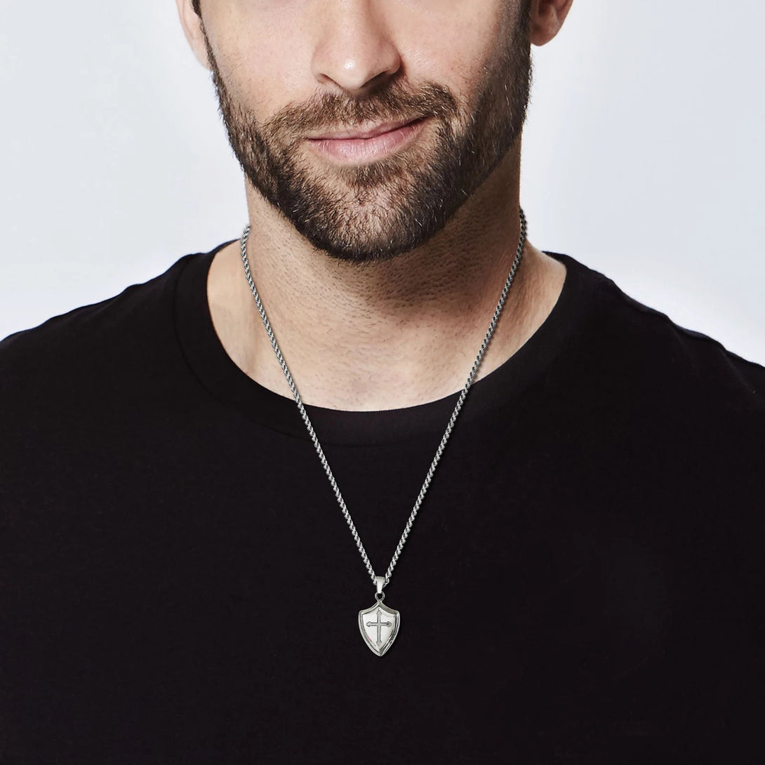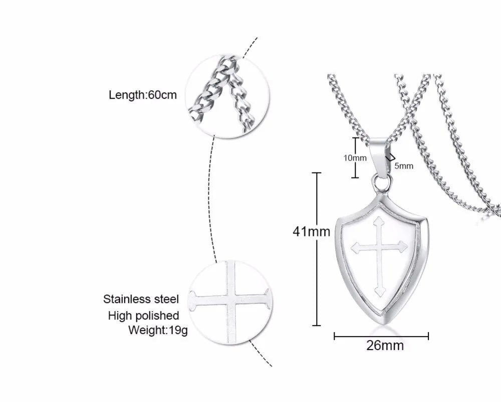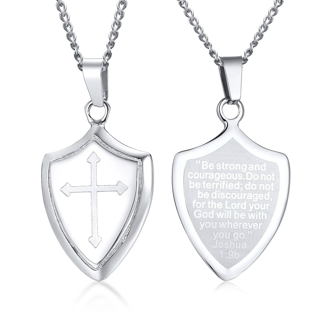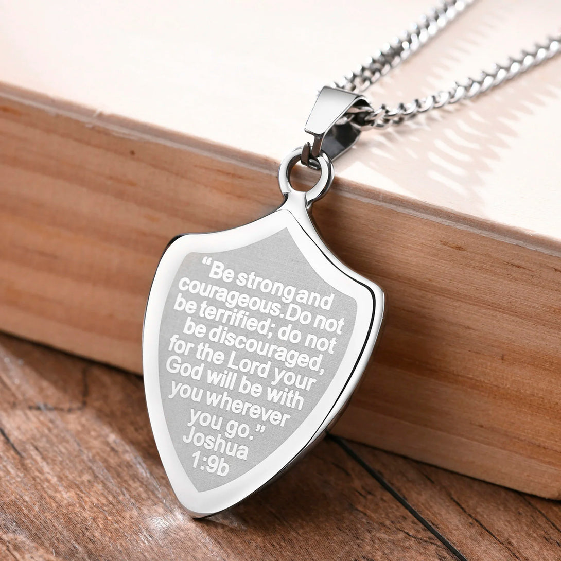 Collar con colgante de cruz con forma de escudo para hombre en acero inoxidable con versículo bíblico "Sé fuerte y valiente", joyería cristiana