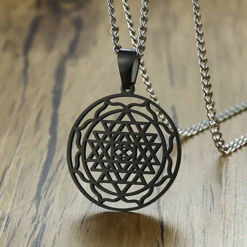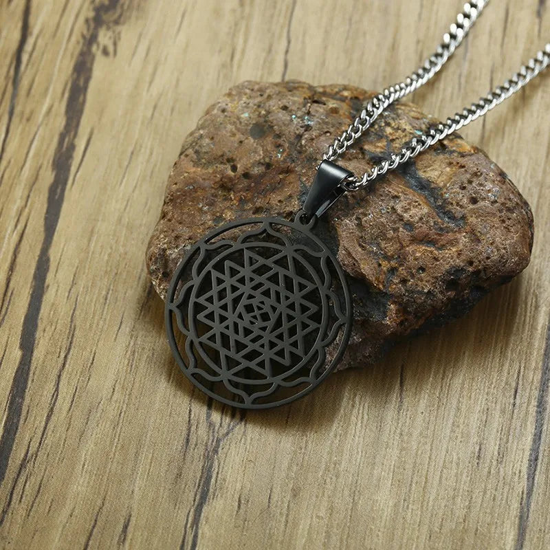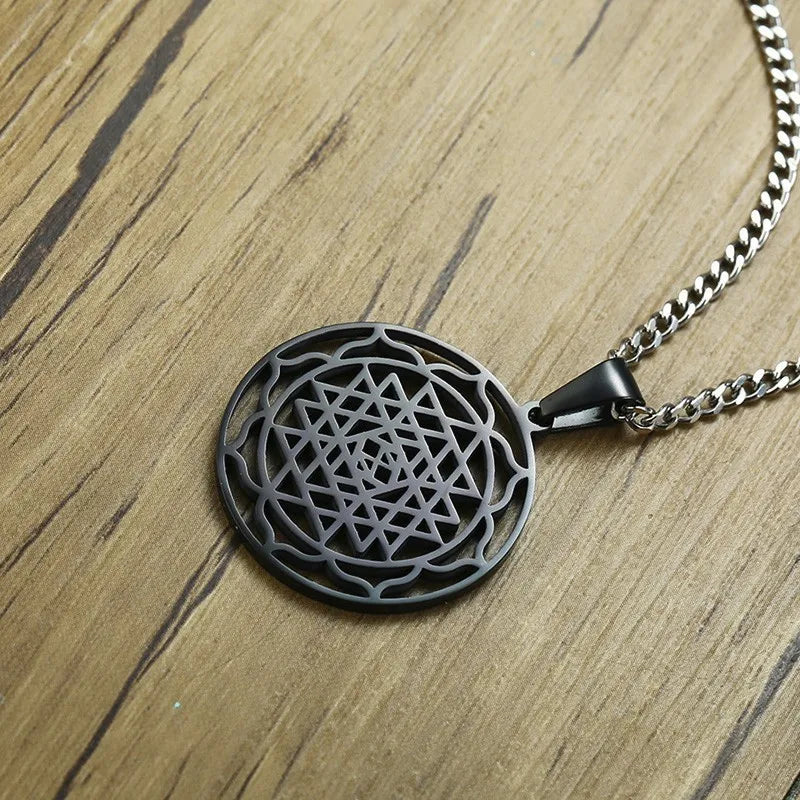 Collar con colgante de mandala Sri Yantra para hombre, de acero inoxidable, color negro, con amuleto de la suerte, joyería espiritual energizada y bendecida, de 24 pulgadas
