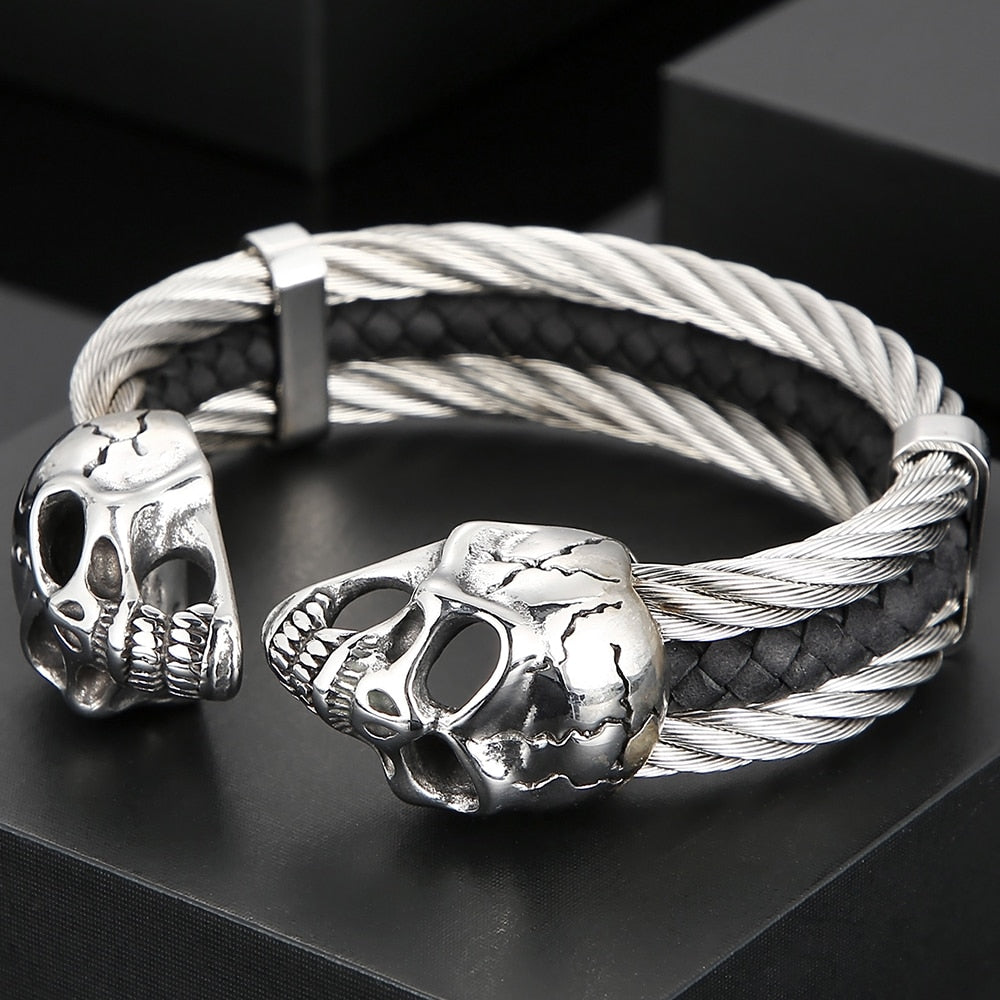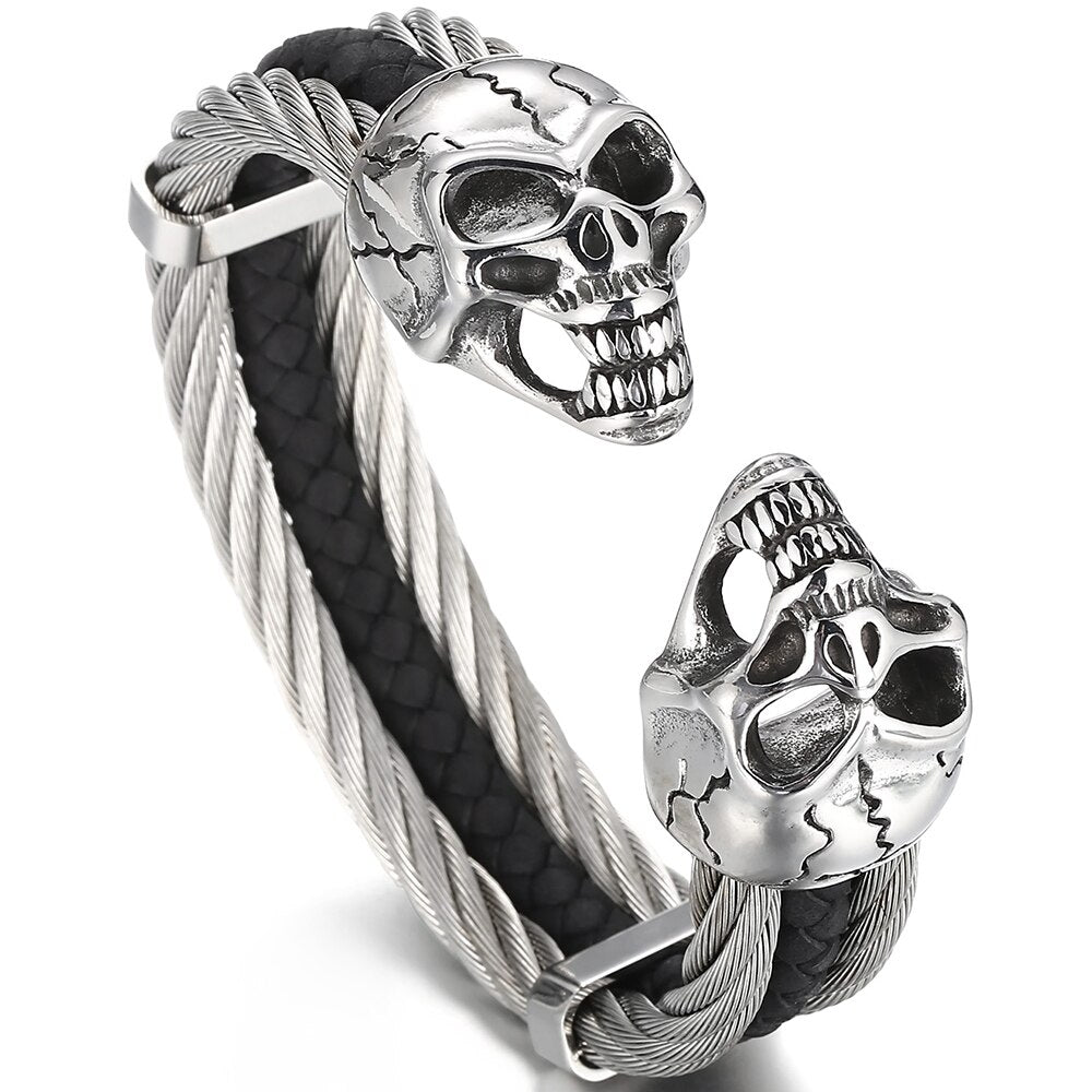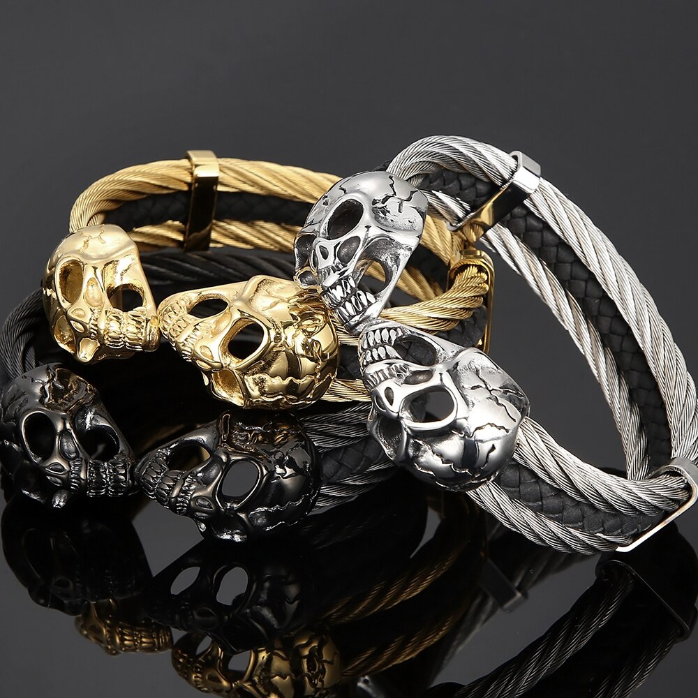 Brazalete abierto de acero inoxidable y cuero con calavera de motociclista para hombre, regalo de cumpleaños