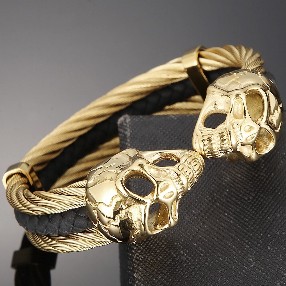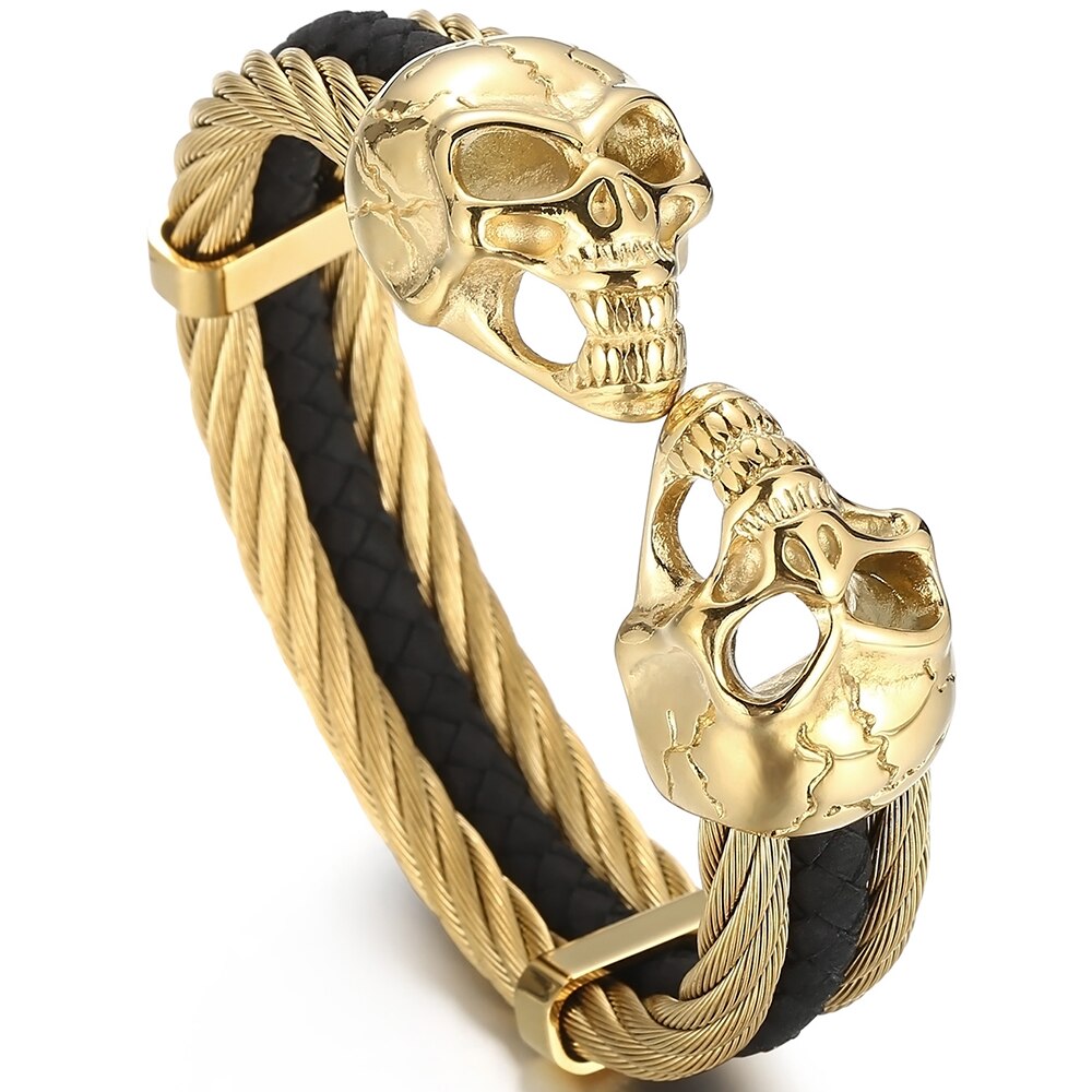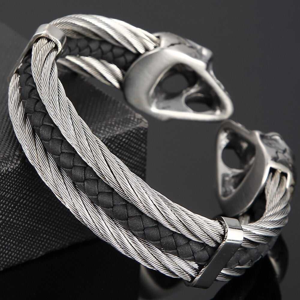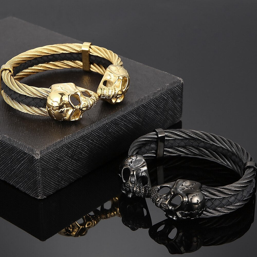 Brazalete abierto de acero inoxidable y cuero con calavera de motociclista para hombre, regalo de cumpleaños