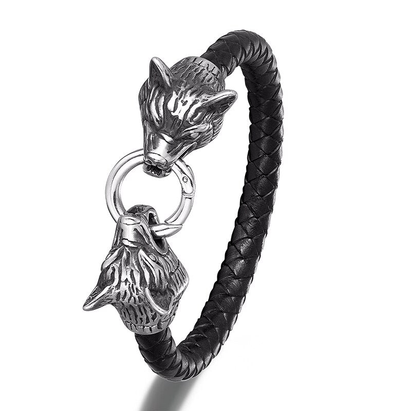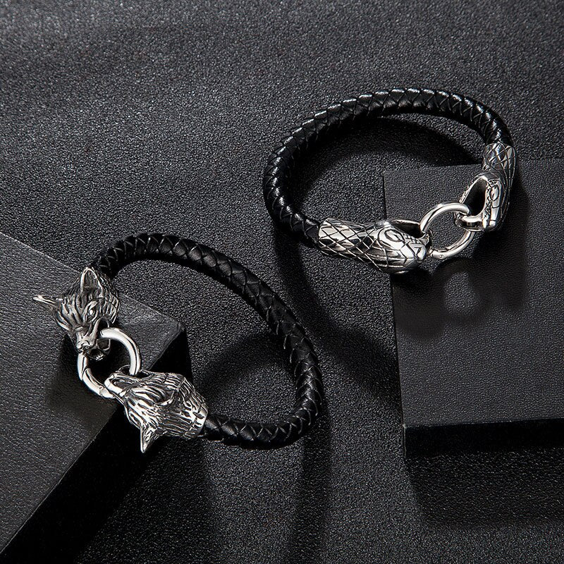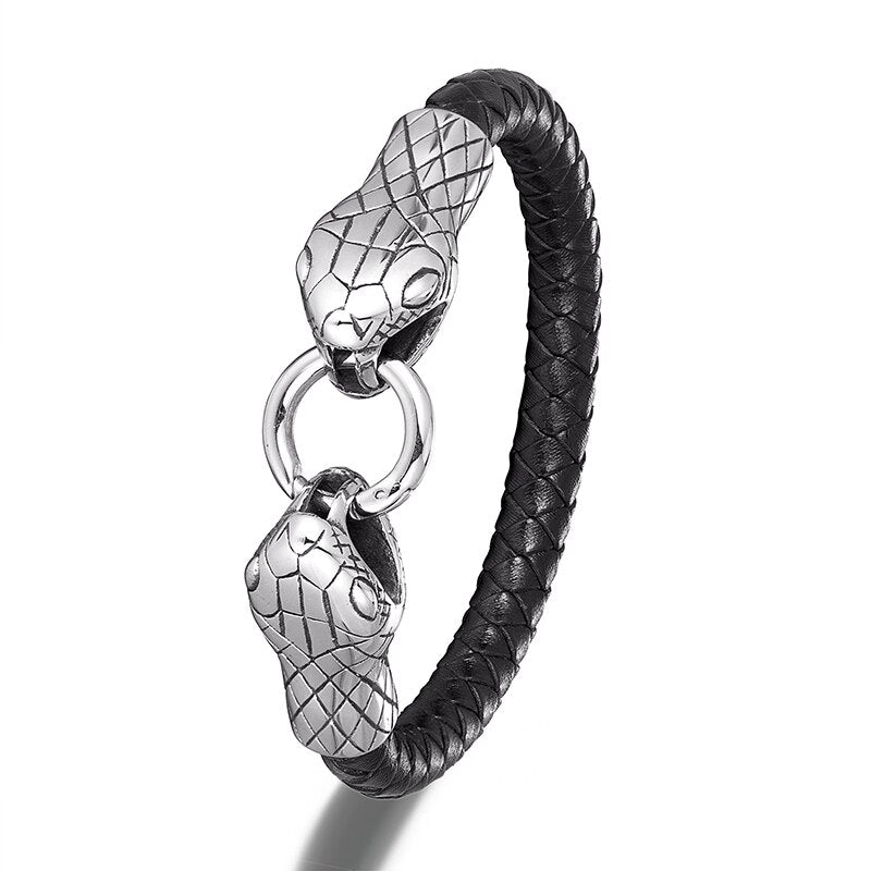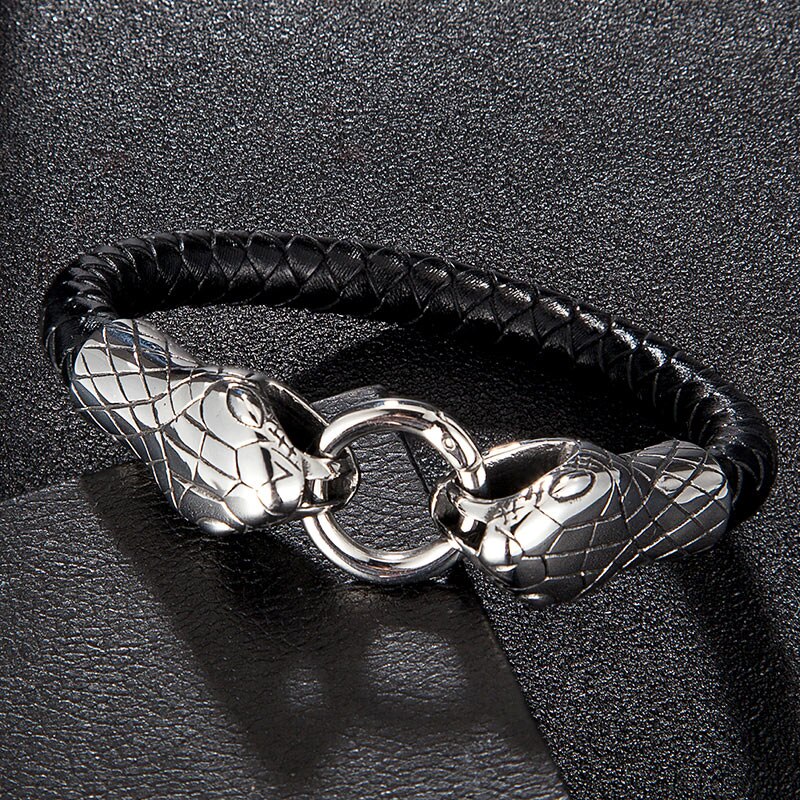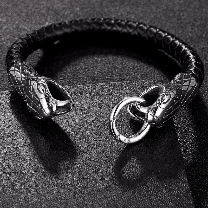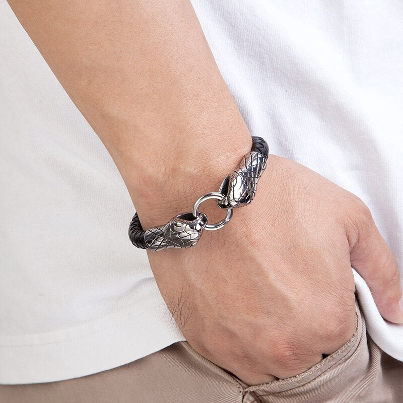 Pulsera de serpiente de acero inoxidable para hombre, brazalete punk rock, amuleto de cuero genuino, joyería de moda para hombre, accesorios hechos a mano, regalo para amigo