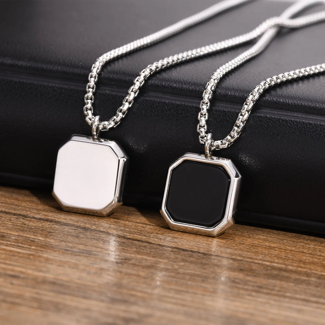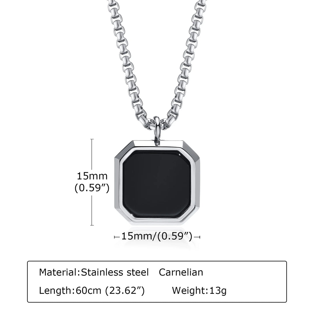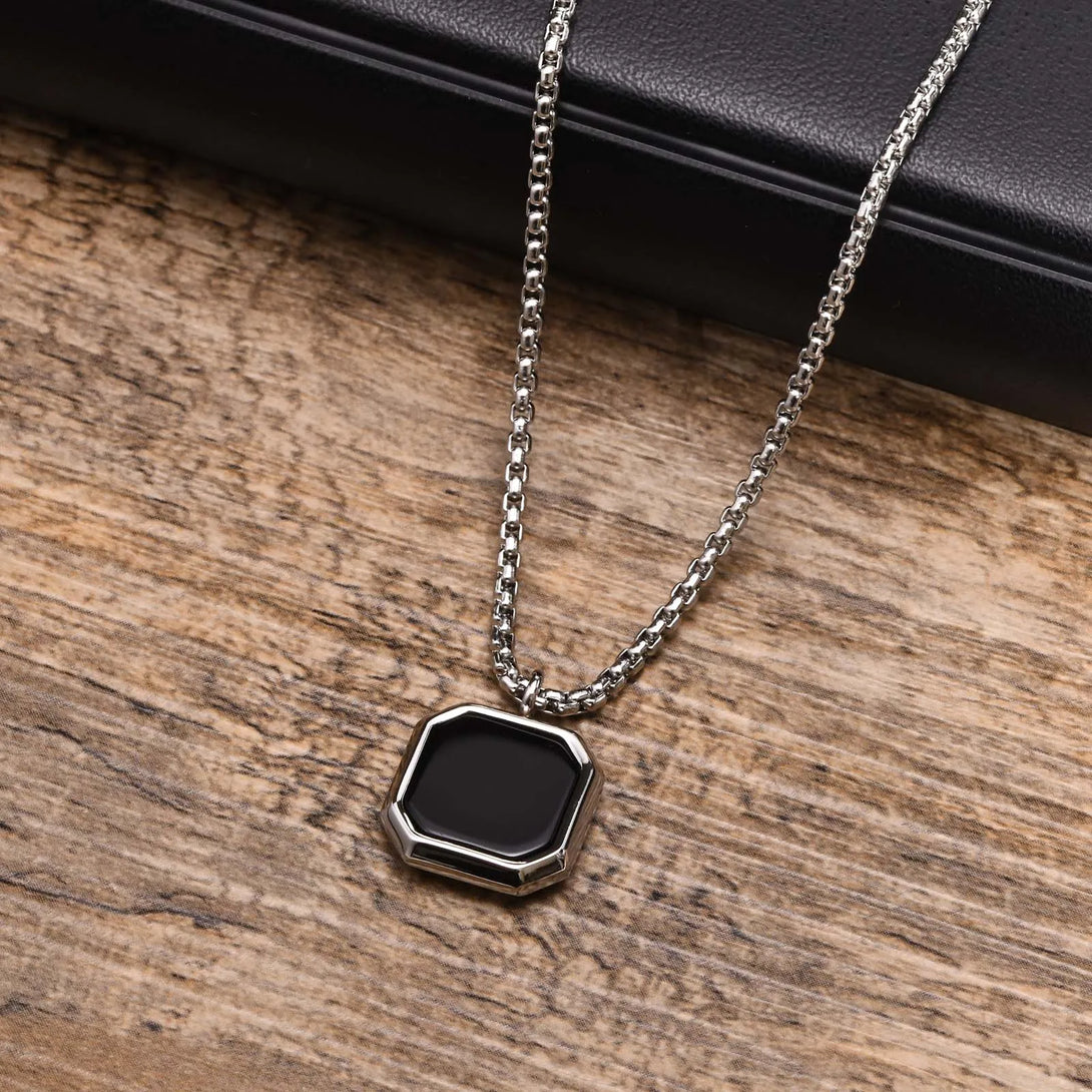 Collar con colgante de piedra cuadrada negra para hombre, elegante, de acero inoxidable, geométrico, resistente al agua, regalo de joyería, cadena de caja de 61 cm.