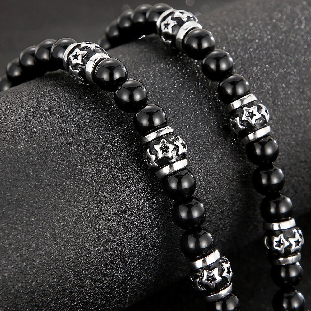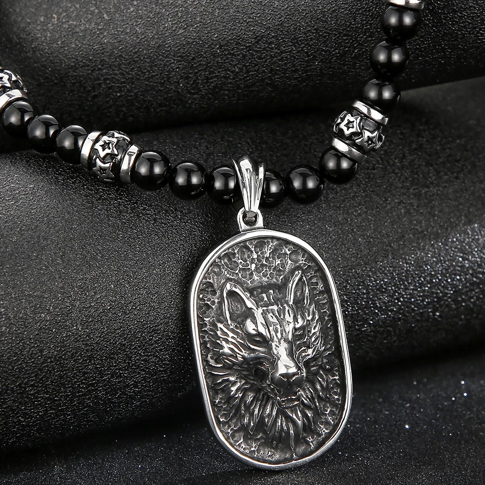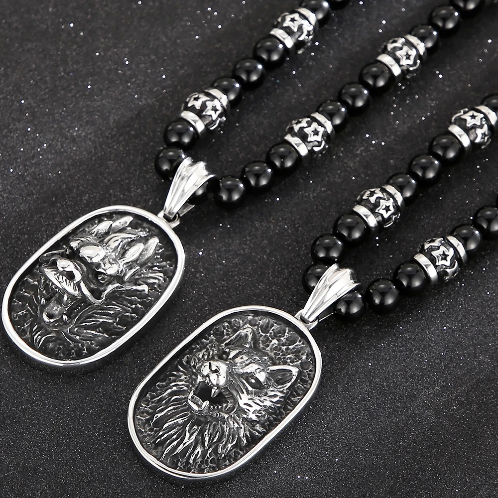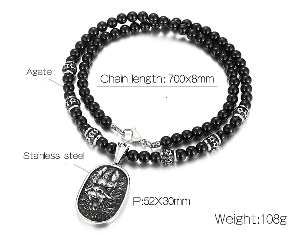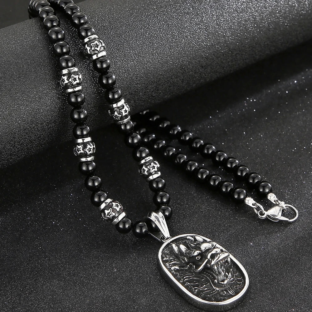 Collar con colgante de cabeza de dragón y lobo para hombre, cadena de cuentas de ágata negra de 70 cm de largo, acero inoxidable, estilo gótico, para motociclistas.