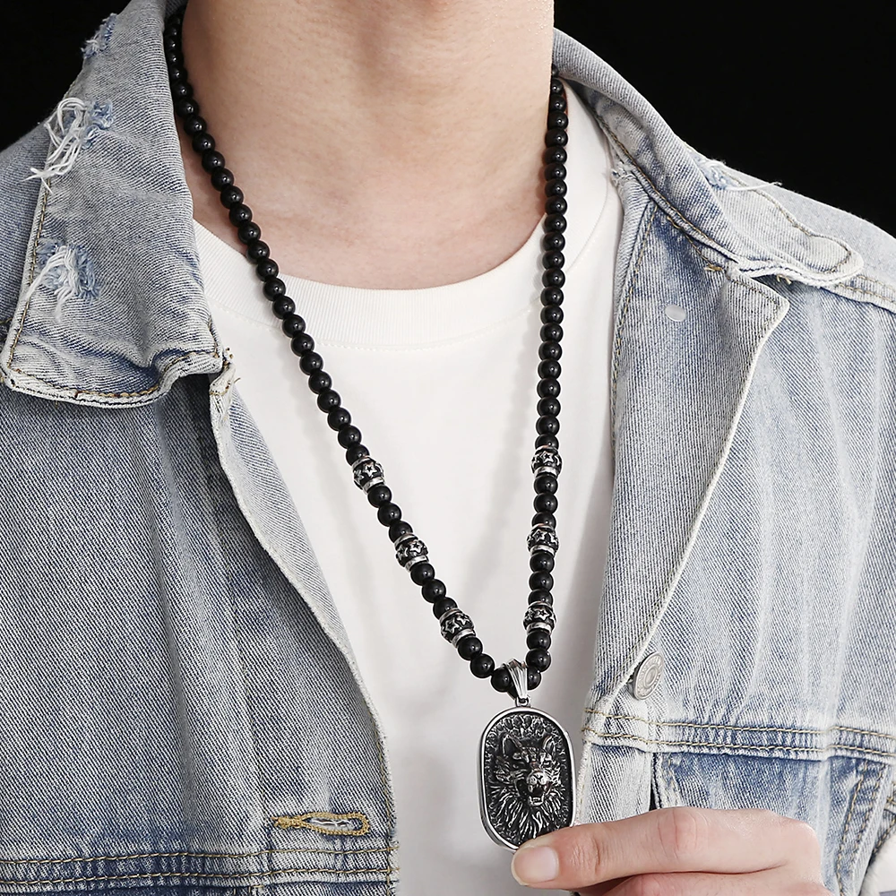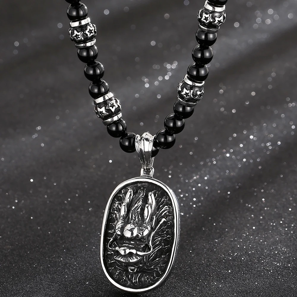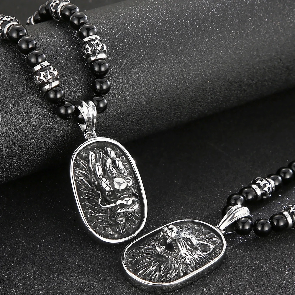 Collar con colgante de cabeza de dragón y lobo para hombre, cadena de cuentas de ágata negra de 70 cm de largo.