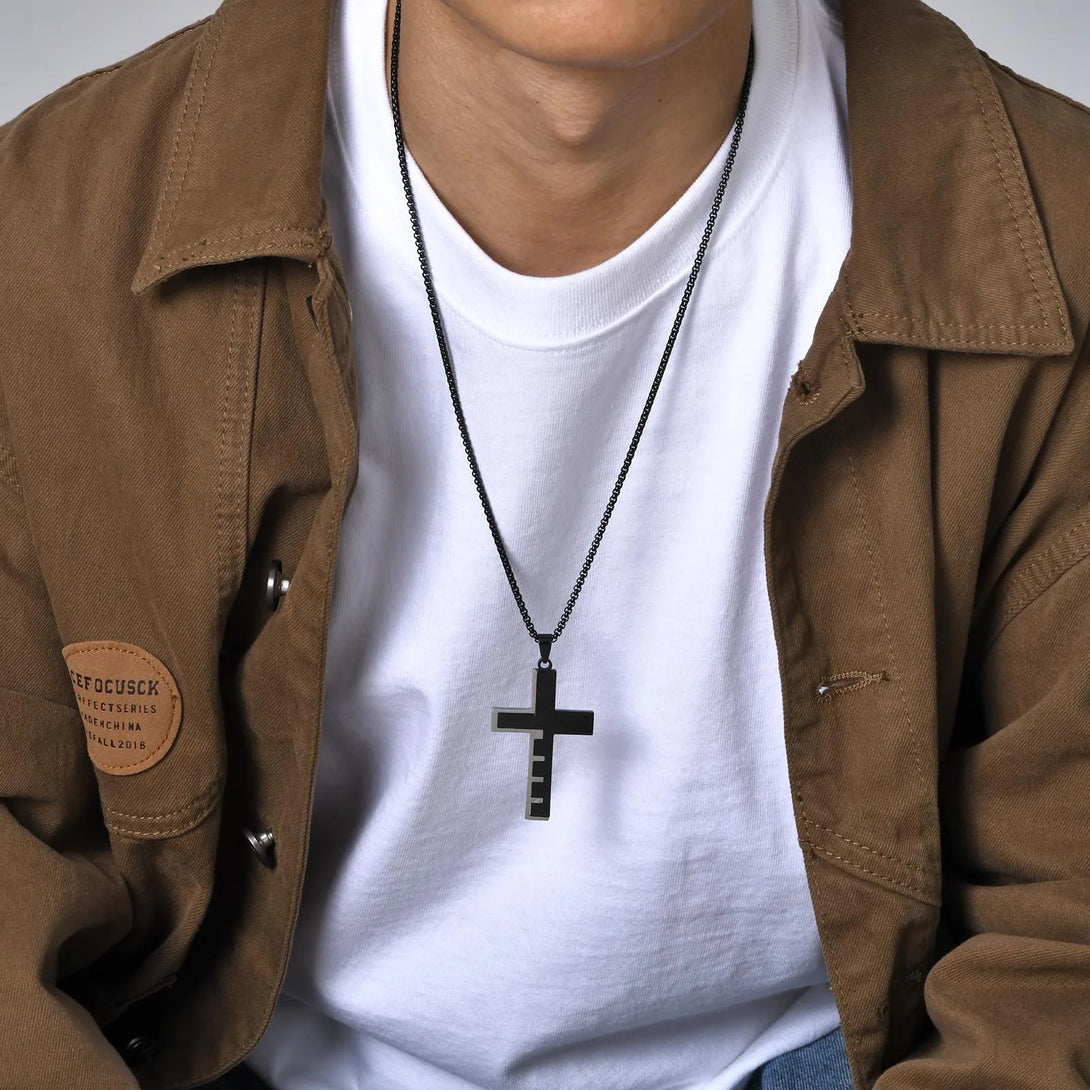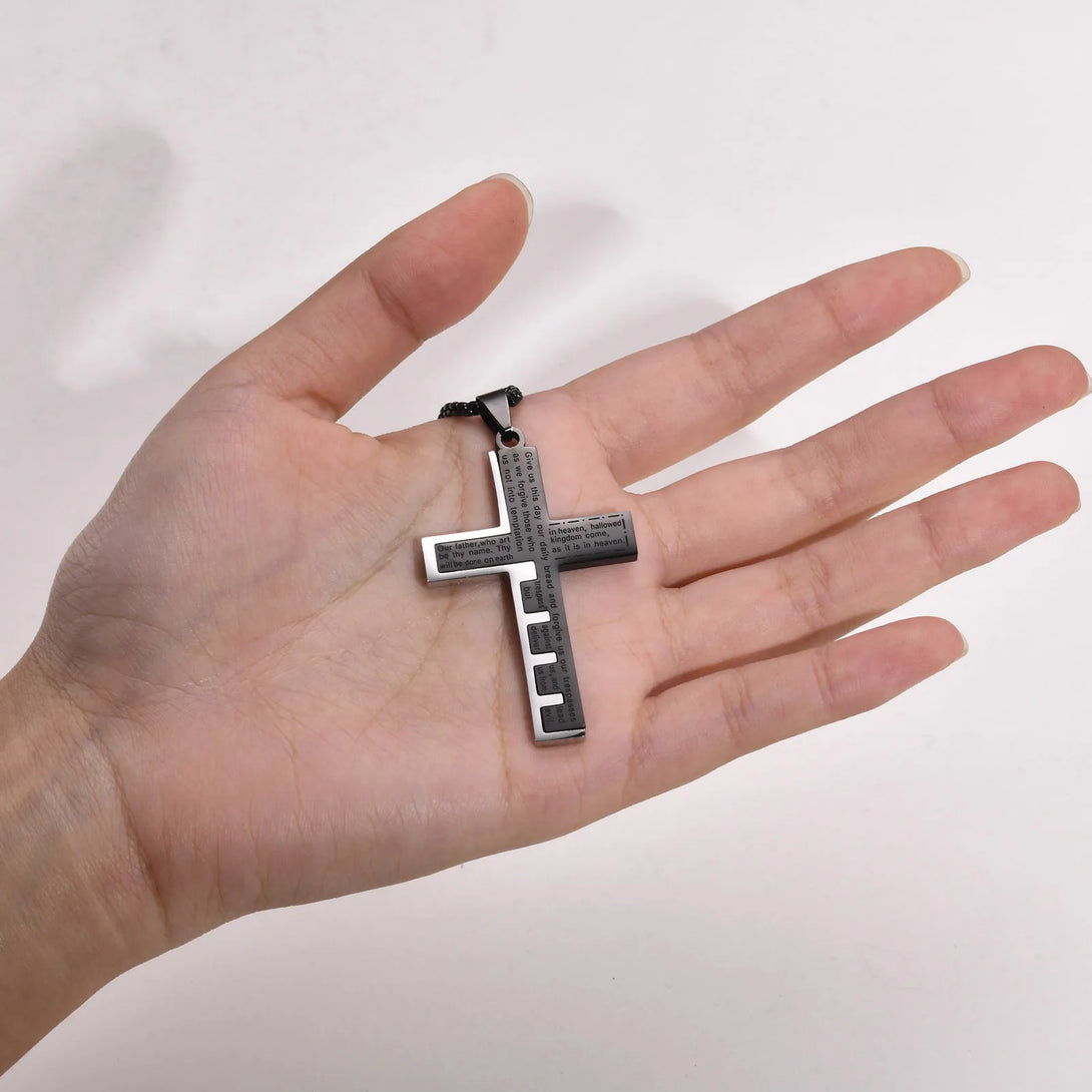 Collar con cruz bíblica para hombre, elegante colgante de acero inoxidable en color negro y plateado.