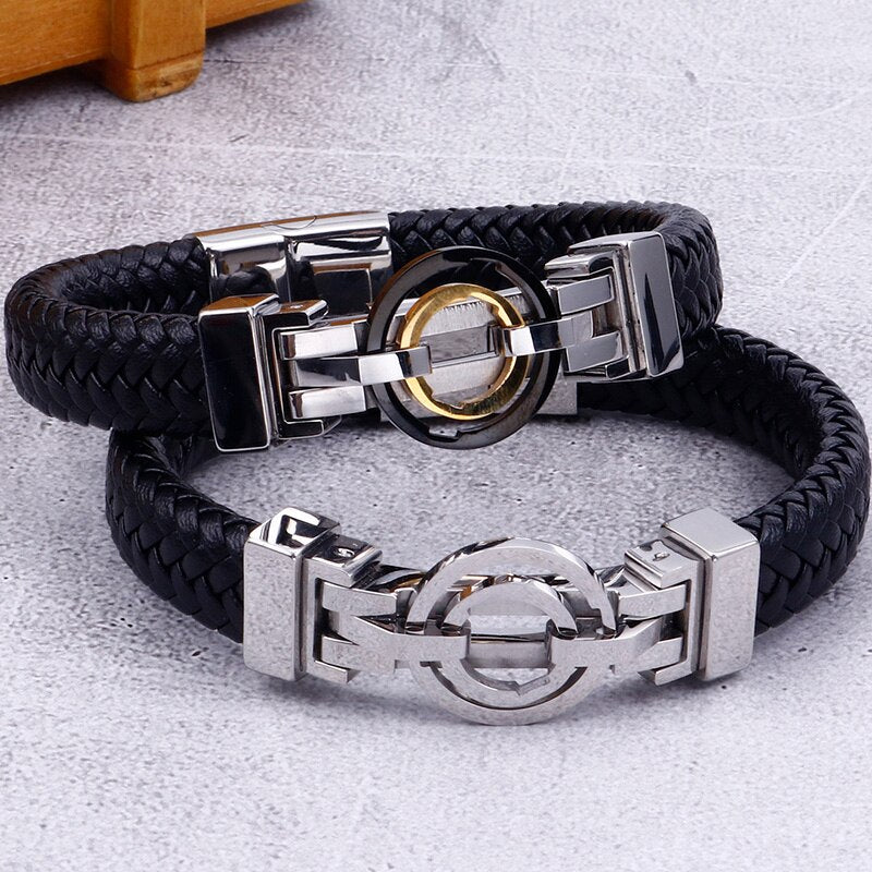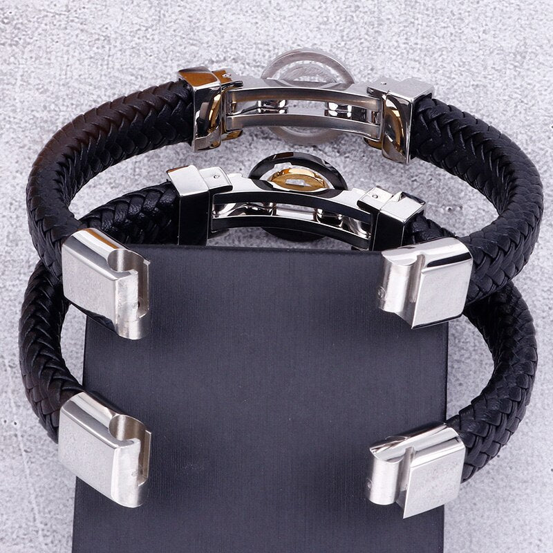 Pulsera de cuero negro para hombre con cierre magnético, pulsera de acero inoxidable trenzada de cuero de vaca.