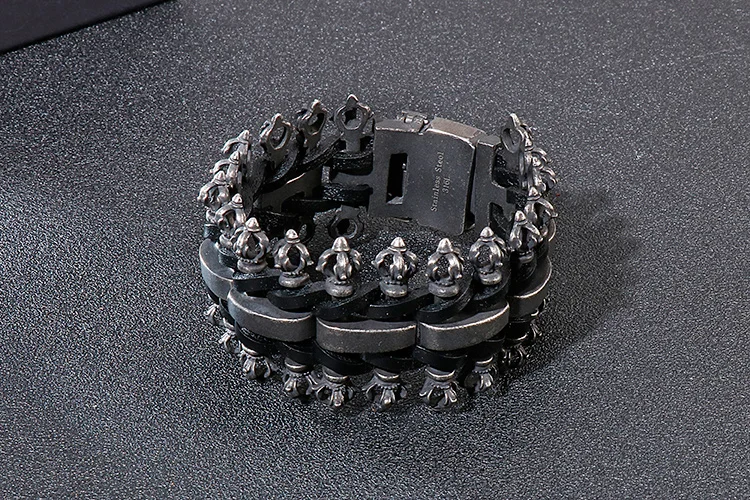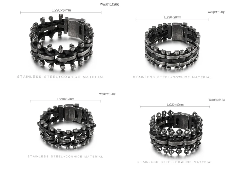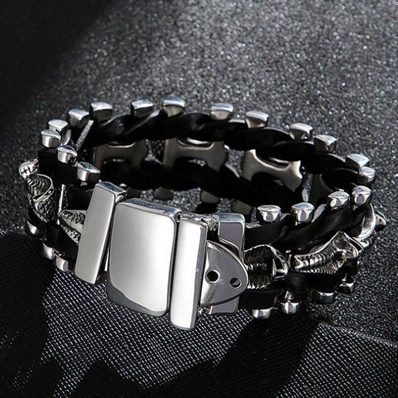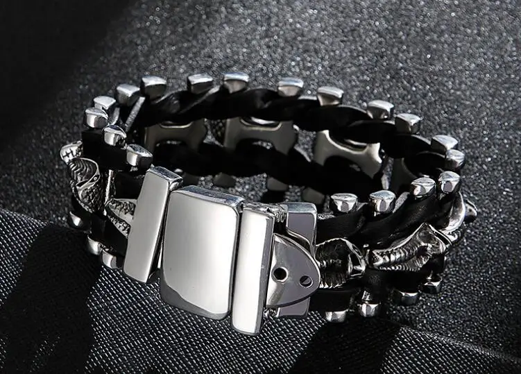 Pulsera de cuero para hombre con calavera y serpiente, brazalete vintage de acero inoxidable con hebilla de cinturón.