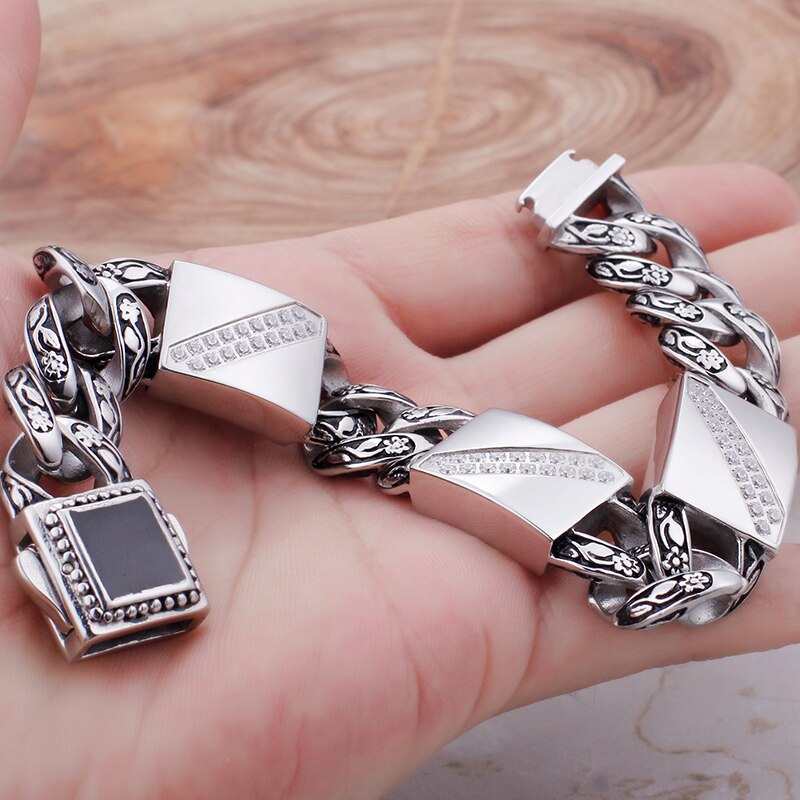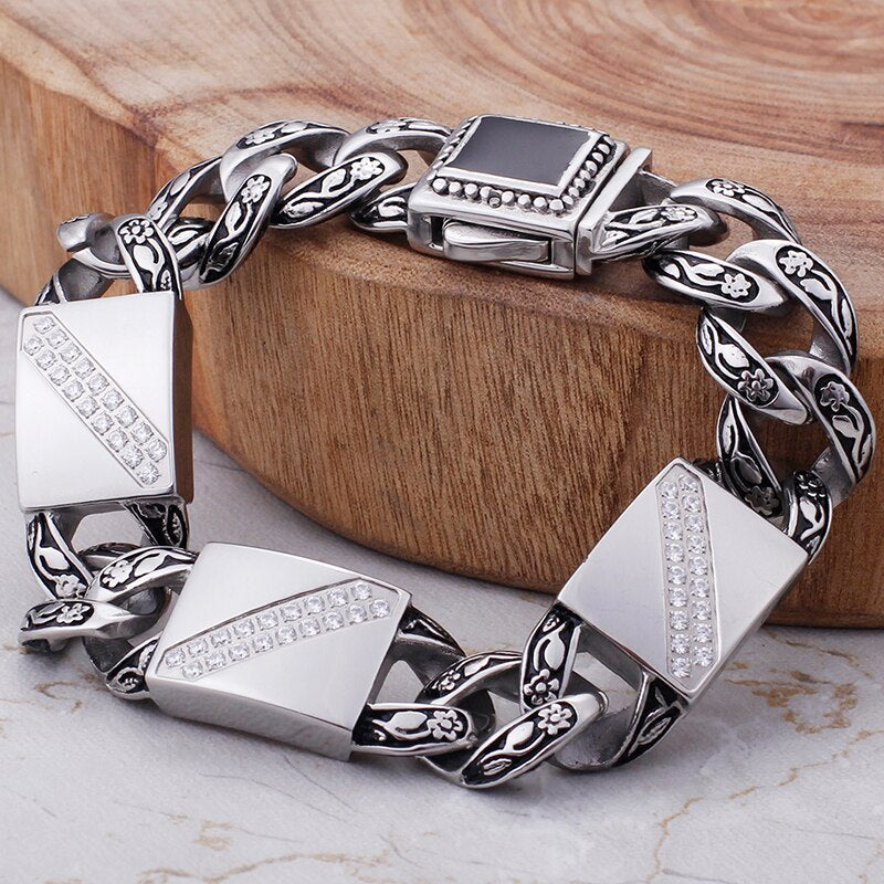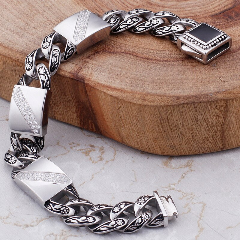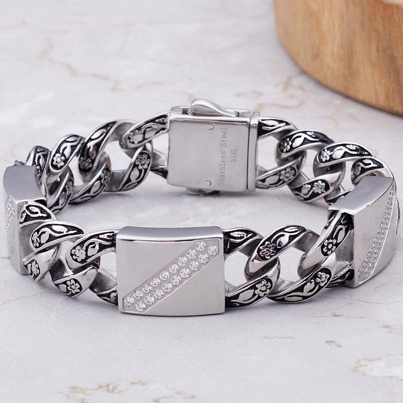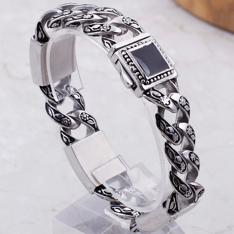 Pulsera de cadena de eslabones estilo vintage de acero inoxidable para hombre con diseño floral, estilo retro, de 8 pulgadas, grabable, con circonita cúbica.