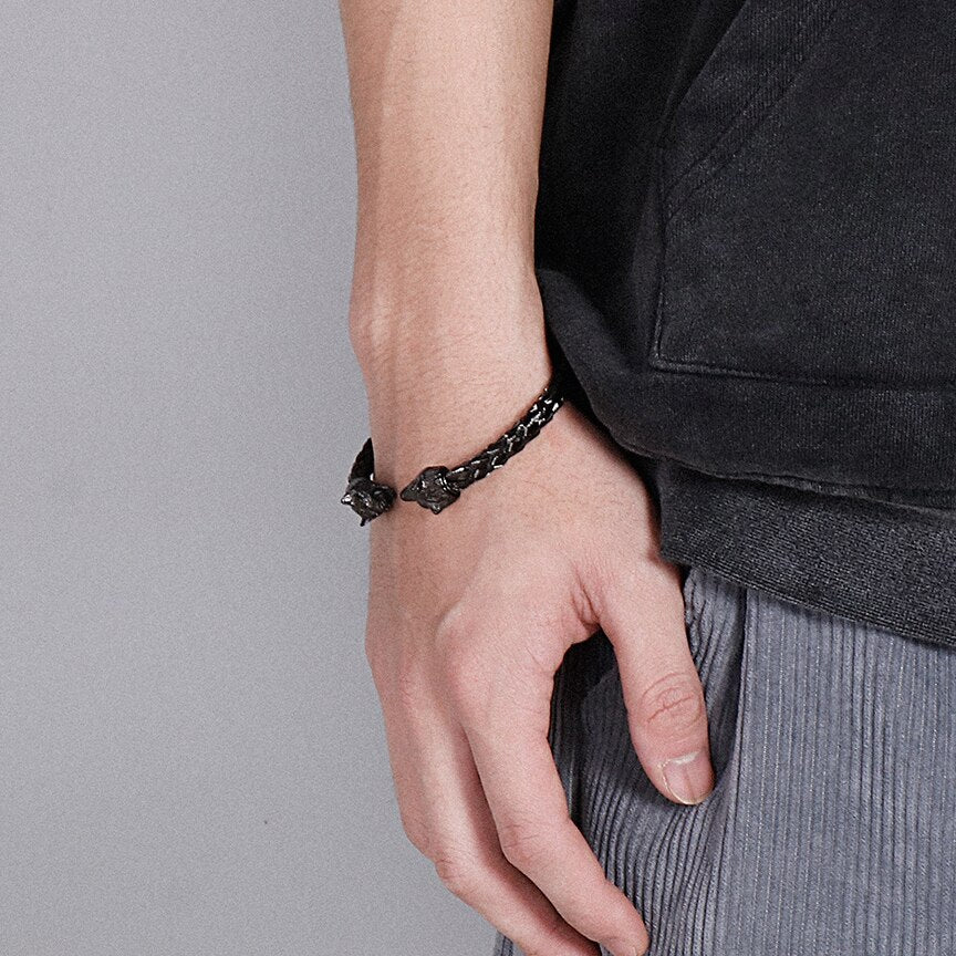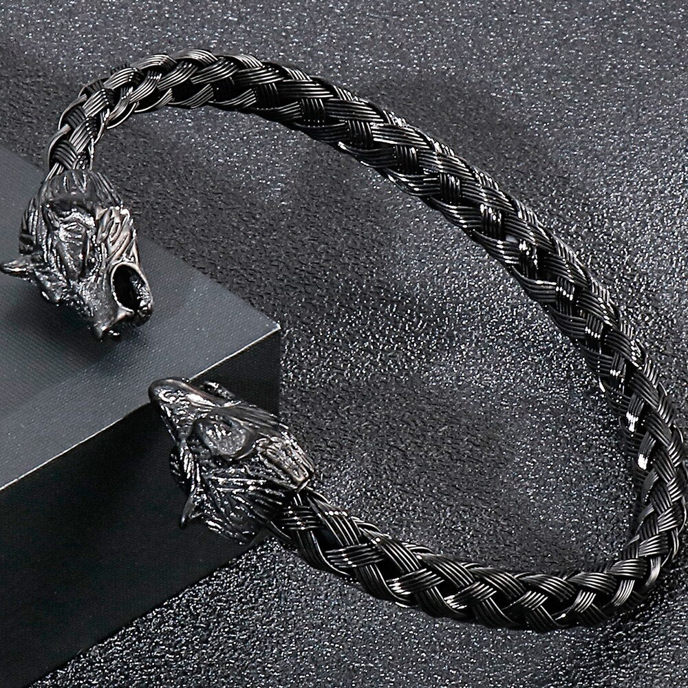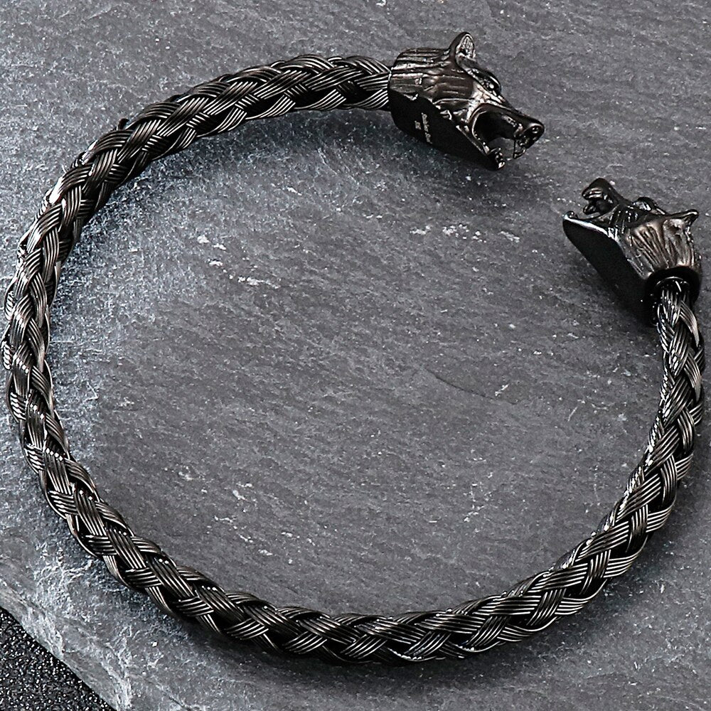 Pulsera de cabeza de lobo para hombre, de acero inoxidable con baño de pistola negra, trenzada, ajustable, estilo hip hop, vikingo.