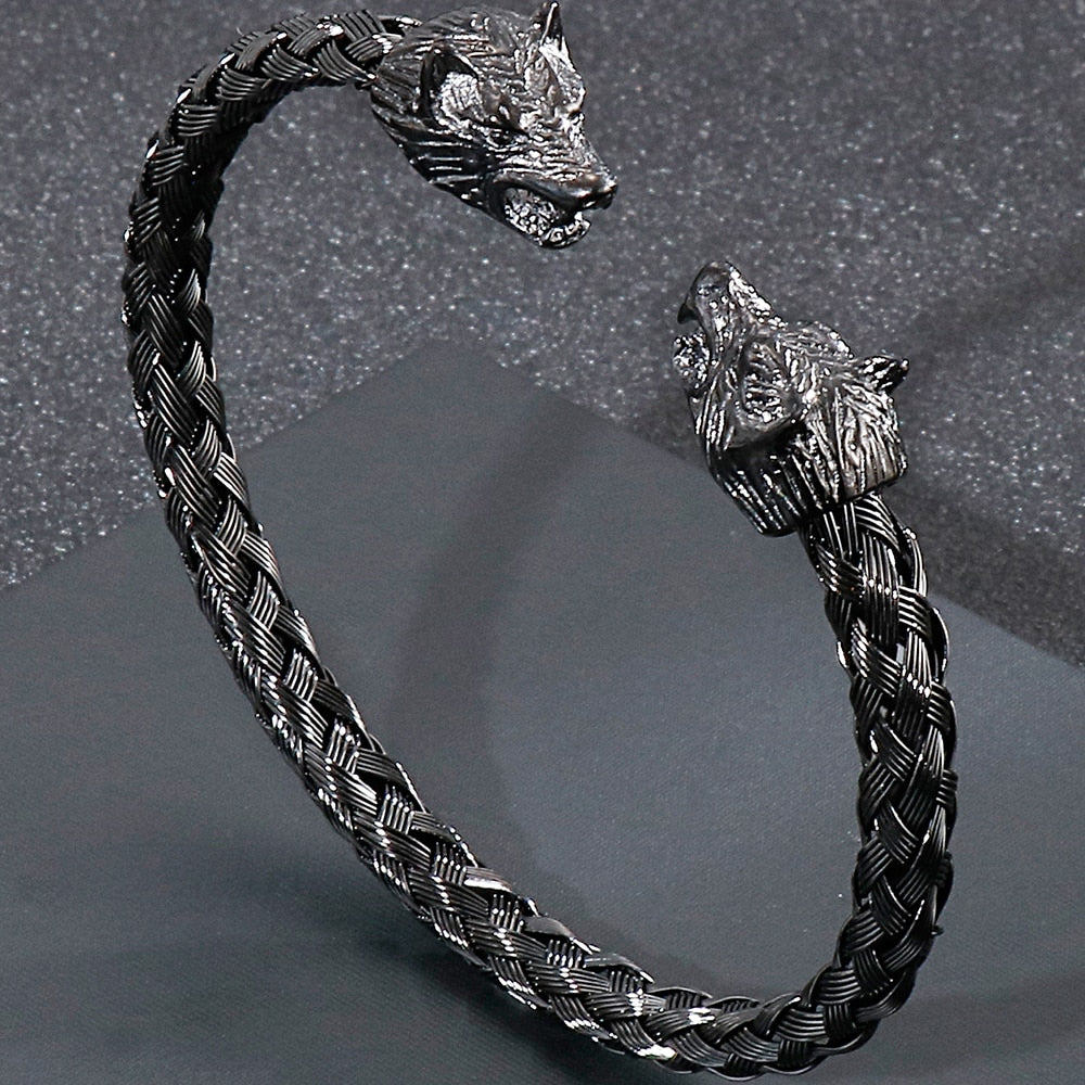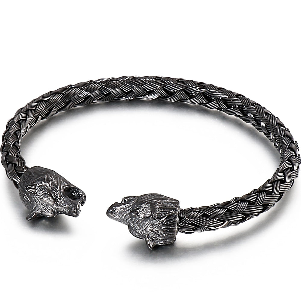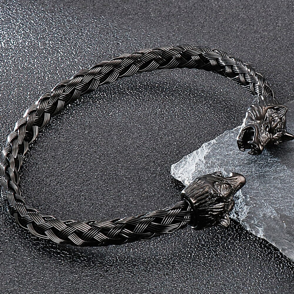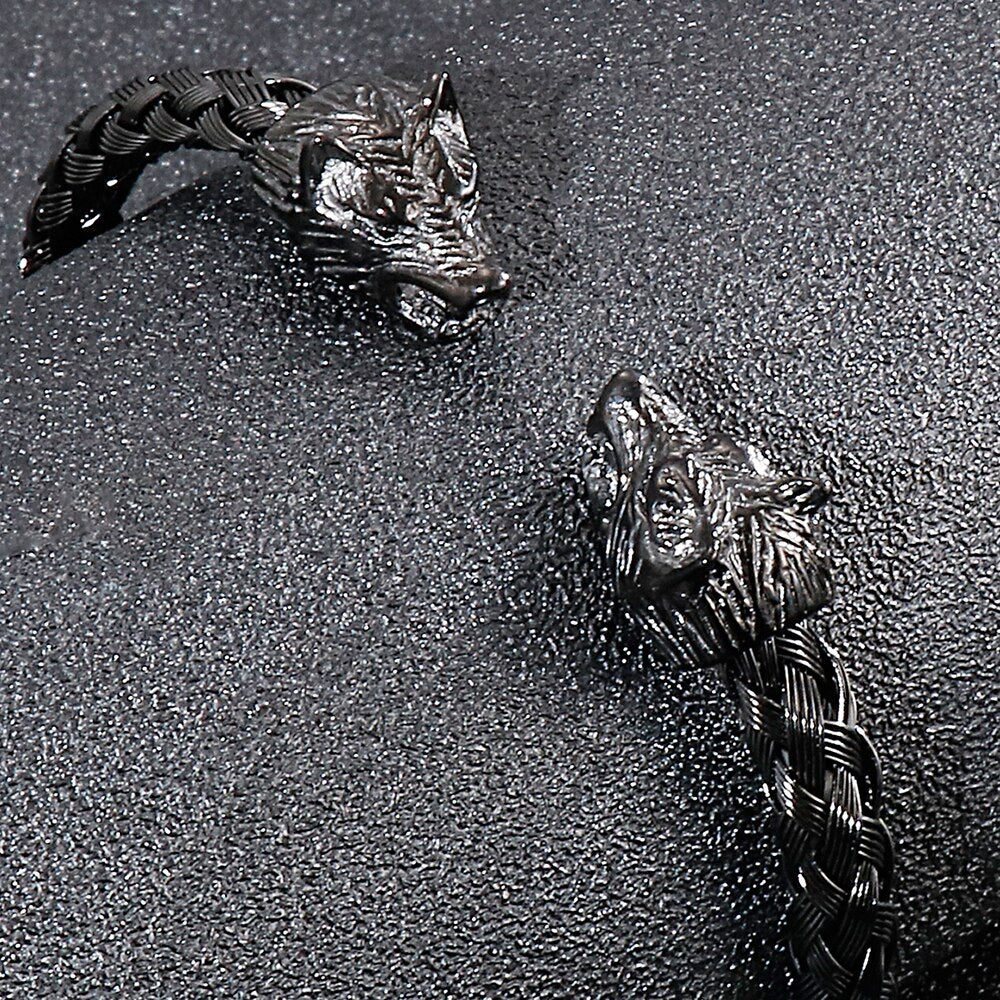 Pulsera de hombre con cabeza de lobo, de acero inoxidable con baño de pistola negra, trenzada, tipo brazalete.
