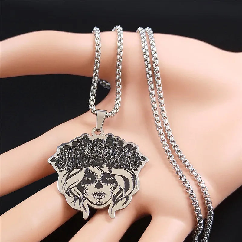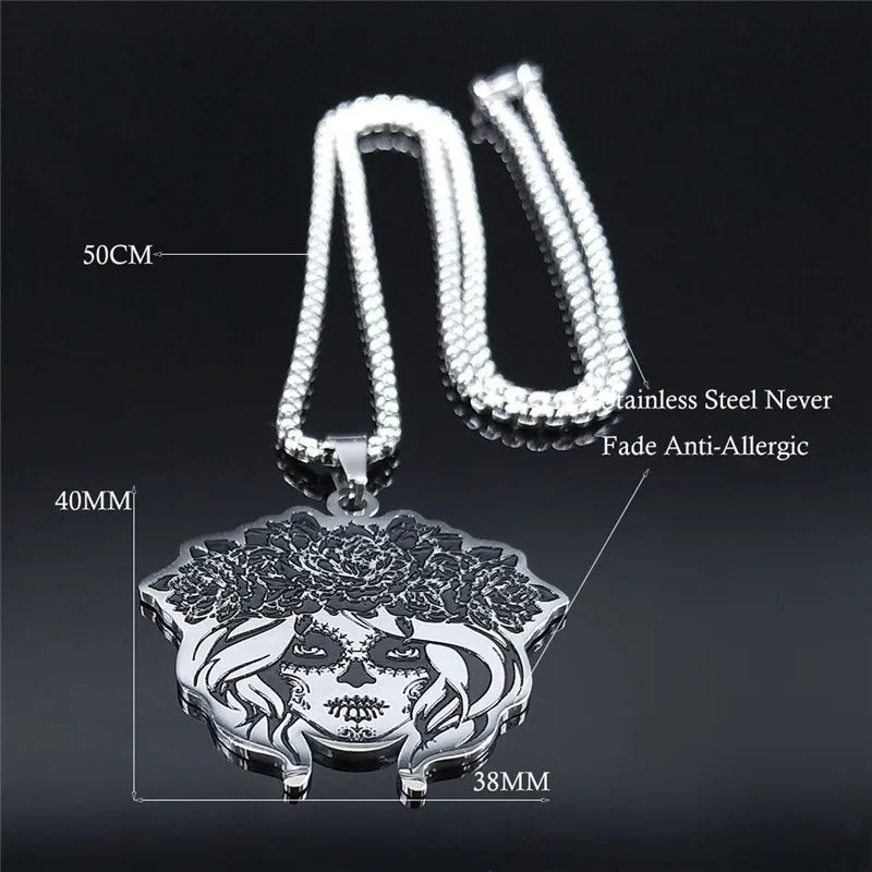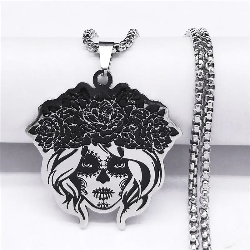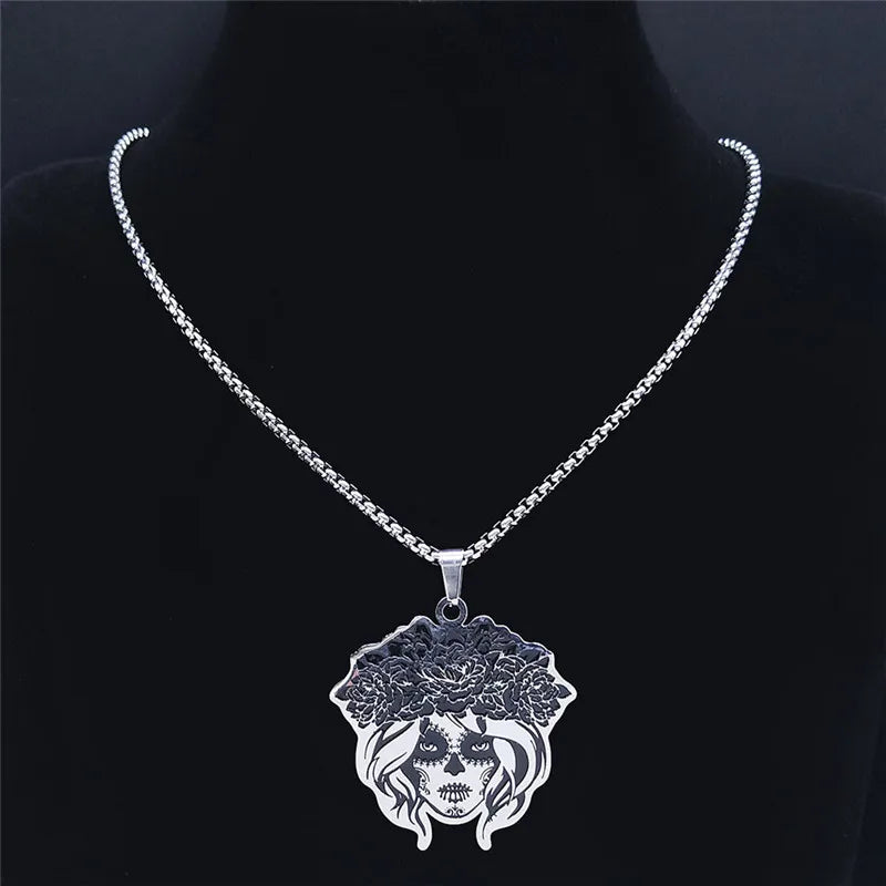 Estilo: Collar de cadena de acero inoxidable con calavera mexicana femenina