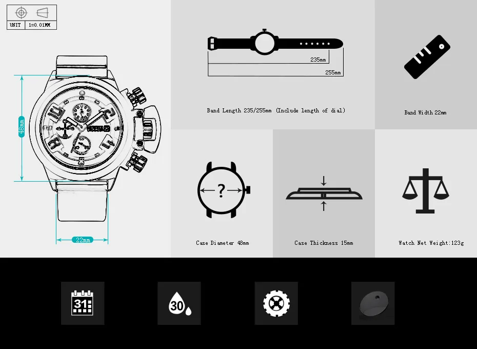 Resistente al agua 3ATM, Temporizador multifunción, Calendario, Esfera grande