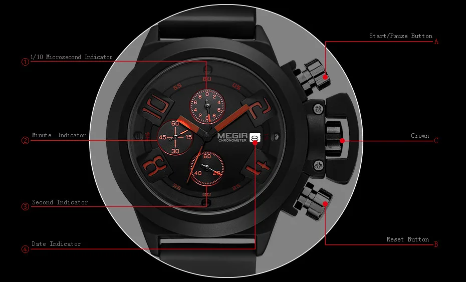 Indicador de cronógrafo: tres indicadores de cronometraje: 1/10 microsegundo, segundo, minuto
