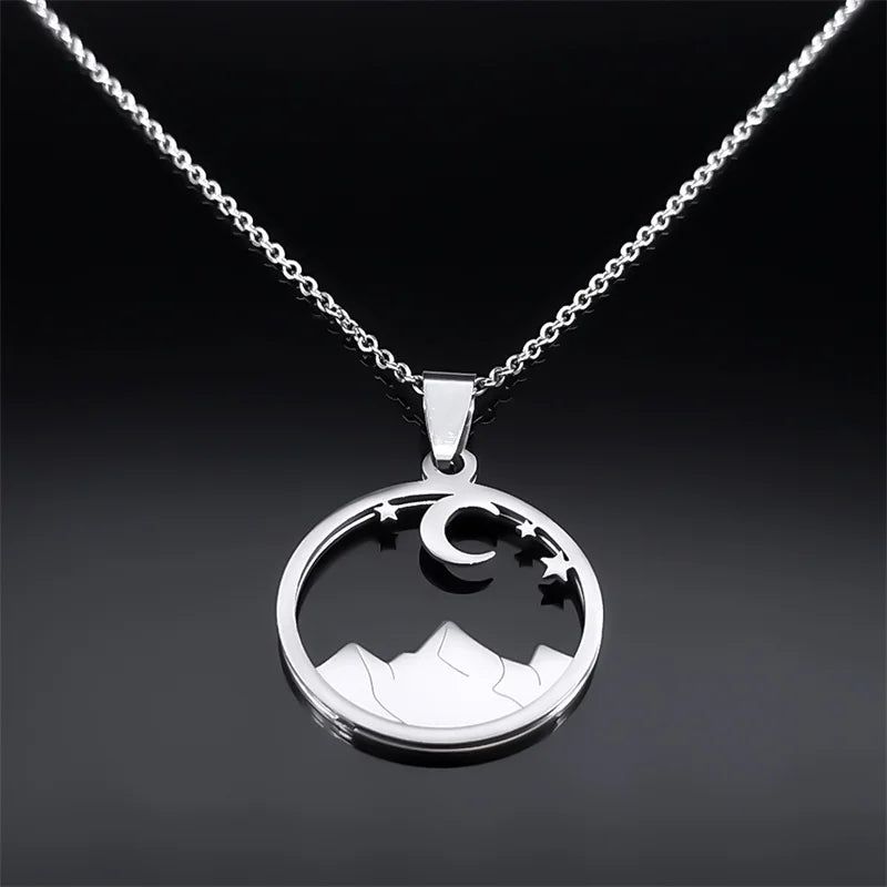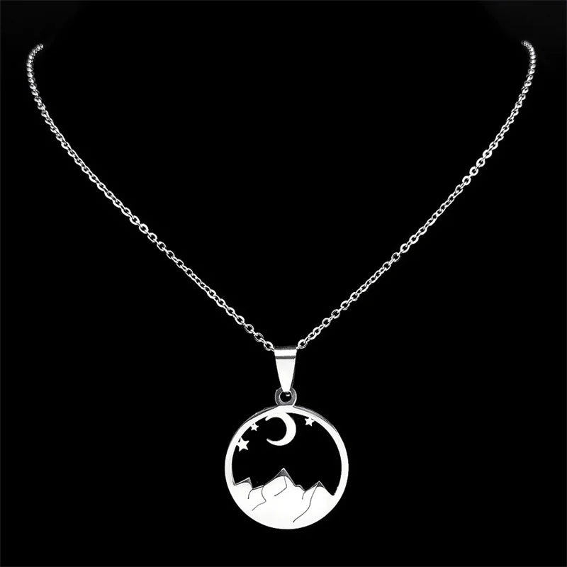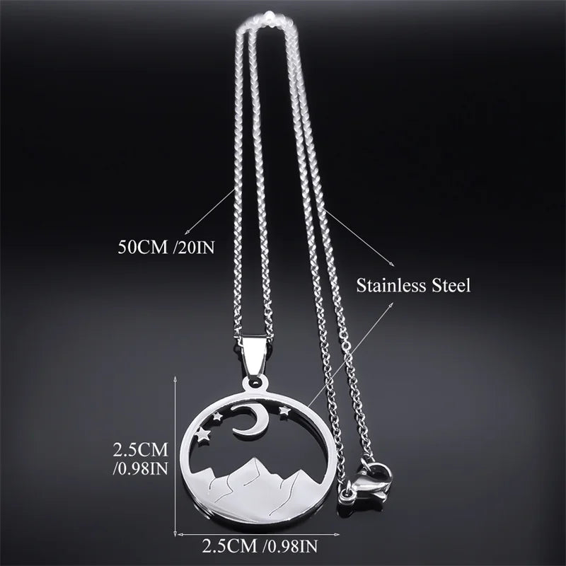 Collar con diseño de luna, estrella y paisaje desértico para mujer y hombre, de acero inoxidable, color plata, de montaña, joyería para mujer