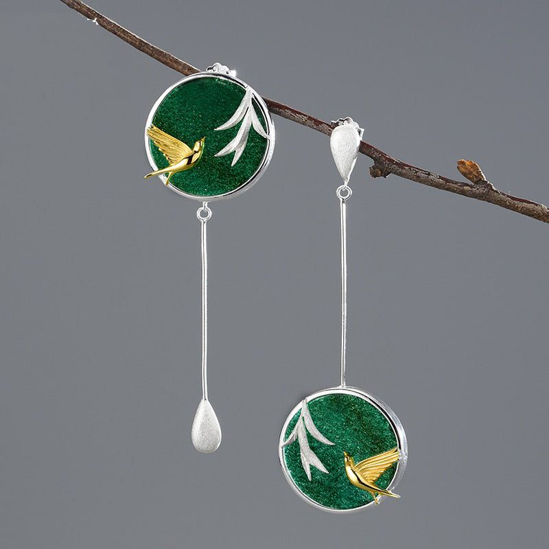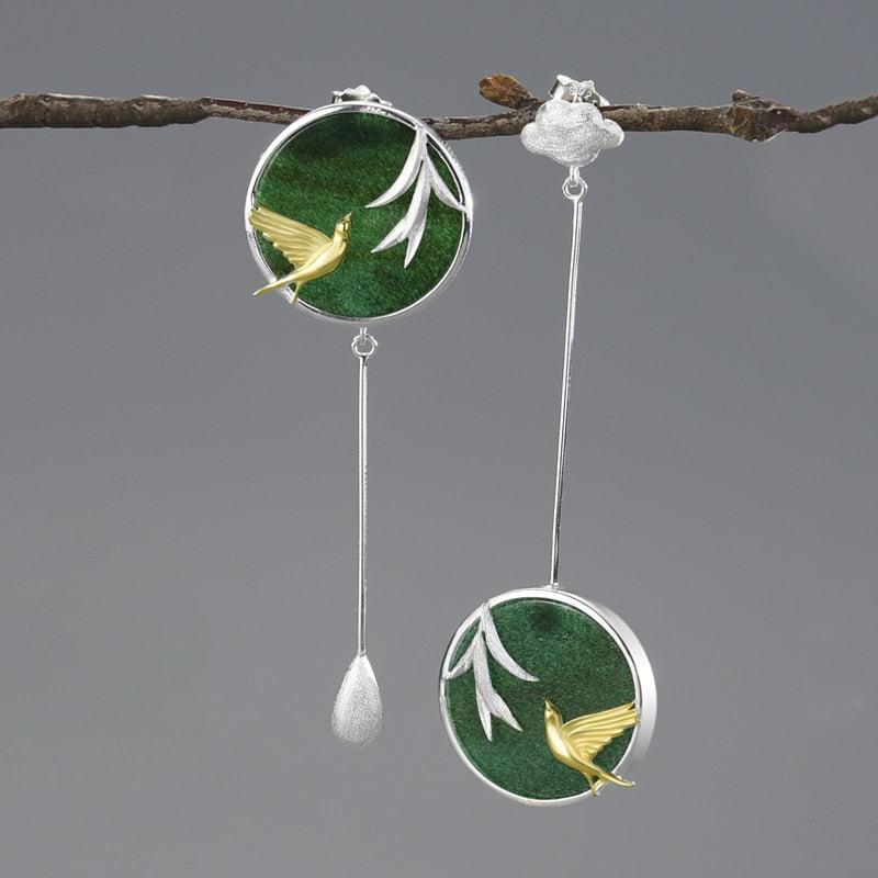 Pendientes de gota de piedra natural en plata de ley 925 auténtica: Golondrina y sauce en primavera.